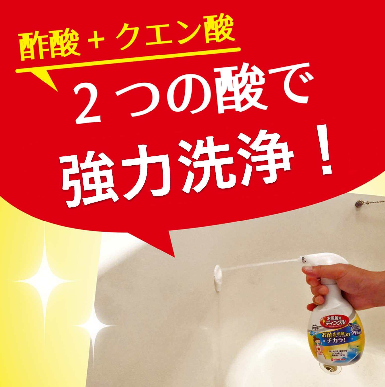 【まとめ買い】お風呂用ティンクル 浴室・浴槽洗剤 すすぎ節水タイプ W スプレー 本体 400ml + 詰め替え用 350ml×2個。 商品紹介 すすぎがとってもラクに。 お風呂そうじで、水も時間も節約。 泡切れがよく、すすぎが簡単で、従来品に比べてすすぎの水、時間が約30%抑えられます。 1回のすすぎ時間が約8秒短縮され、1,600mlの節水が可能。 原材料・成分 酢酸(1.5%)、界面活性剤、キレート剤、溶剤 使用方法 使用する時はスプレー先端部をまわして「ON」に合わせる。 汚れに直接スプレーし、スポンジなどでこすった後、水で洗い流す。 汚れがひどい場合には、2分から3分おいてからスポンジなどでこすった後、水で洗い流してください。 除菌(黒カビ汚れ、ピンクぬめりの原因菌を含む)には、スプレーして1分おいてから水で洗い流してください。 ※水で薄まると除菌効果が低下することがあるので、水を拭き取ってから使用すると効果的です。 使用後は必ずスプレー先端部を「OFF」に合わせて保管する。 ※液がなくなったら「つめかえ用」(別売)をお求め下さい。 このスプレー容器は「お風呂用ティンクルすすぎ節水タイプW」専用です。 お酢のチカラで石けんカス・湯アカ汚れをすっきり落とす。 すすぎがとってもラクに。 お風呂そうじで、水も時間も節約。 泡切れがよく、すすぎが簡単で、従来品に比べてすすぎの水、時間が約30%抑えられます。 1回のすすぎ時間が約8秒短縮され、1,600mlの節水が可能。 【内容量】本体400ml、詰め替え350ml×2個。 【香り】アップル。 S000-K9999