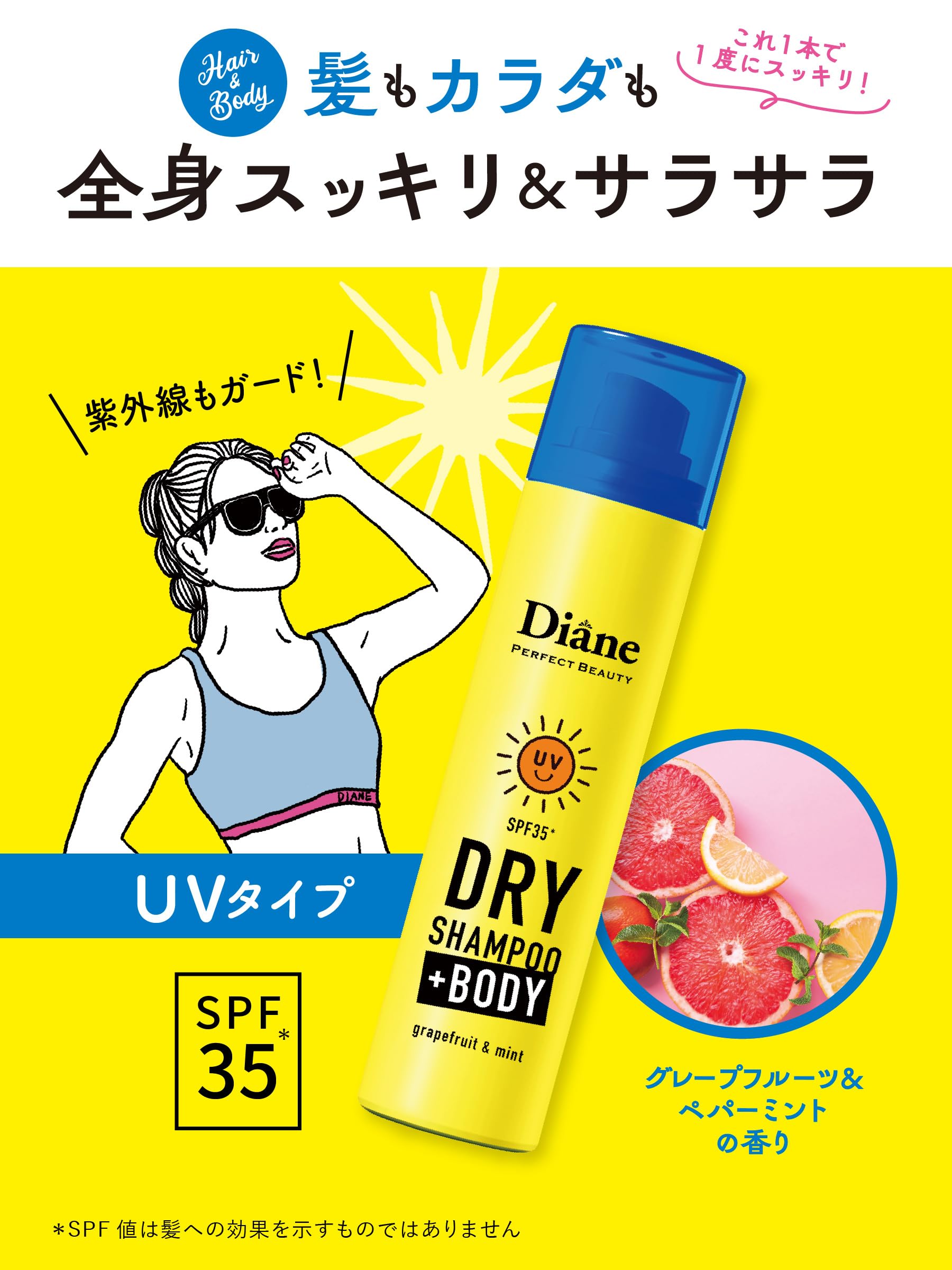 ダイアン デオドラントスプレー ボディ用 ドライシャンプー [UVケア]グレープフルーツ&ペパーミントの香り 95g +BODY プラスボディ 制汗 スプレー。 商品紹介 髪にもからだにも使えるSPF35*のドライシャンプー。 汗や皮脂によるベタつきを抑え、紫外線から髪・からだを守ります。 グレープフルーツ&ペパーミントの香り。 *SPF値は髪への効果を示すものではありません ※パッケージデザイン等は予告なく変更されることがあります 原材料・成分 LPG、エタノール、シクロペンタシロキサン、メトキシケイヒ酸エチルヘキシル、オクテニルコハク酸デンプンAl 、ミリスチン酸イソプロピル、オクトクリレン、t-ブチルメトキシジベンゾイルメタン、ジメチコン、オキシベンゾン-3、シリカ、香料、乳酸メンチル、BHT、水、BG、アルガニアスピノサ核油、テトラヘキシルデカン酸アスコルビル、シア脂、グリコール酸、ポリ-ε-リシン、ライム果汁、アセトン、ステアルジモニウムヒドロキシプロピル加水分解ケラチン(羊毛)、オレンジ果汁、セイヨウハッカ葉エキス、セージ葉エキス、レモン果汁、レモングラス葉/茎エキス、ユーカリ葉エキス、グレープフルーツ果実エキス、リンゴ果実エキス、ナツメ果実エキス、サンザシエキス、トコフェロール 使用方法 容器を上下によく振ってからお使いください。 使用前に缶を上下によく振り、お肌から10cm以上離して適量をスプレーしてください。 安全警告 〈ご使用上の注意〉お肌に異常が生じていないかよく注意して使用してください。 目に入らないよう注意し、目に入ったときはこすらずにすぐに洗い流し、異物感が残る場合は眼科医にご相談ください。 顔面には使用しないでください。 換気のよい場所で使用し、吸入しないでください。 同じ箇所に連続して1秒以上噴射しないでください。 粉っぽさが気になるかたは、タオルなどでふきとってください。 2~3時間で付け直してください。 頭皮や肌に傷、はれもの、湿しん等、異常のある時は、使わないでください。 使用中や使用後日光に当たって、赤み、はれ、かゆみ、刺激、色抜け(白斑等)や黒ずみ等の異常が現れた時は、使用を中止し、皮ふ科専門医等へのご相談をおすすめします。 乳幼児の手の届かないところに置いてください。 床についた場合はすべりやすくなるのですぐにふきとってください。 髪にもからだにも使えるSPF35*のドライシャンプー。 汗や皮脂によるベタつきを抑え、紫外線から髪・からだを守ります。 グレープフルーツ&ペパーミントの香り。 *SPF値は髪への効果を示すものではありません。 S000-K9999