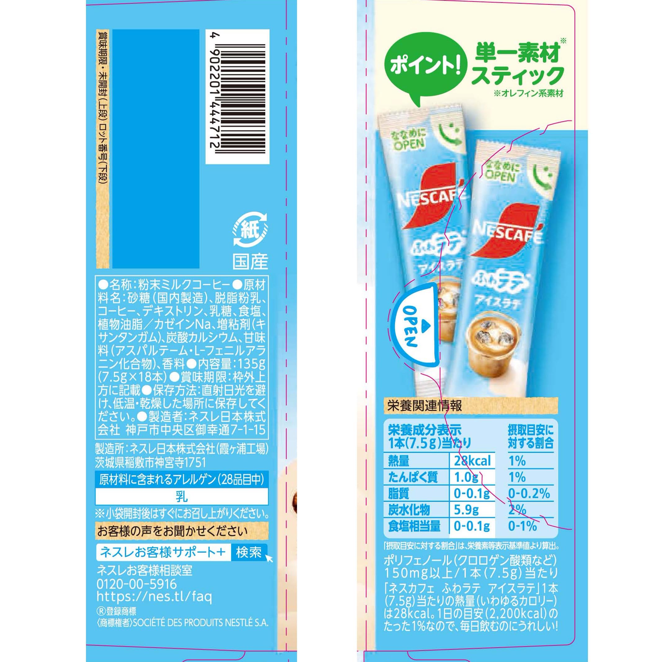 ネスカフェ ふわラテ アイスラテ 18P,箱,カフェラテ,個包装。 商品紹介 ふわっとした泡とクリーミーな味わいが特長の「ふわラテ」シリーズ。 (1杯ずつ楽しめる便利なミックスタイプスティック製品)クリーミーでなめらかな口あたりでありながら、やさしいミルクの味わいとコーヒーのバランスが絶妙なこだわりの一杯です。 お気に入りの1杯を冷たい水を混ぜるだけで簡単にアイスラテでも楽しめます。 原材料・成分 砂糖(国内製造)、脱脂粉乳、コーヒー、デキストリン、乳糖、食塩、植物油脂/カゼインNa、増粘剤(キサンタンガム)、炭酸カルシウム、甘味料(アスパルテーム・L-フェニルアラニン化合物)、香料。 ふわっとした泡とクリーミーな味わいが特長の「ふわラテ」シリーズ。 1杯ずつ楽しめる便利なミックスタイプスティック製品。 クリーミーでなめらかな口あたりでありながら、やさしいミルクの味わいとコーヒーのバランスが絶妙なこだわりの一杯です。 お気に入りの1杯を冷たい水を混ぜるだけで簡単にアイスラテでも楽しめます。 メーカー名:ネスレ日本。 S000-K9999