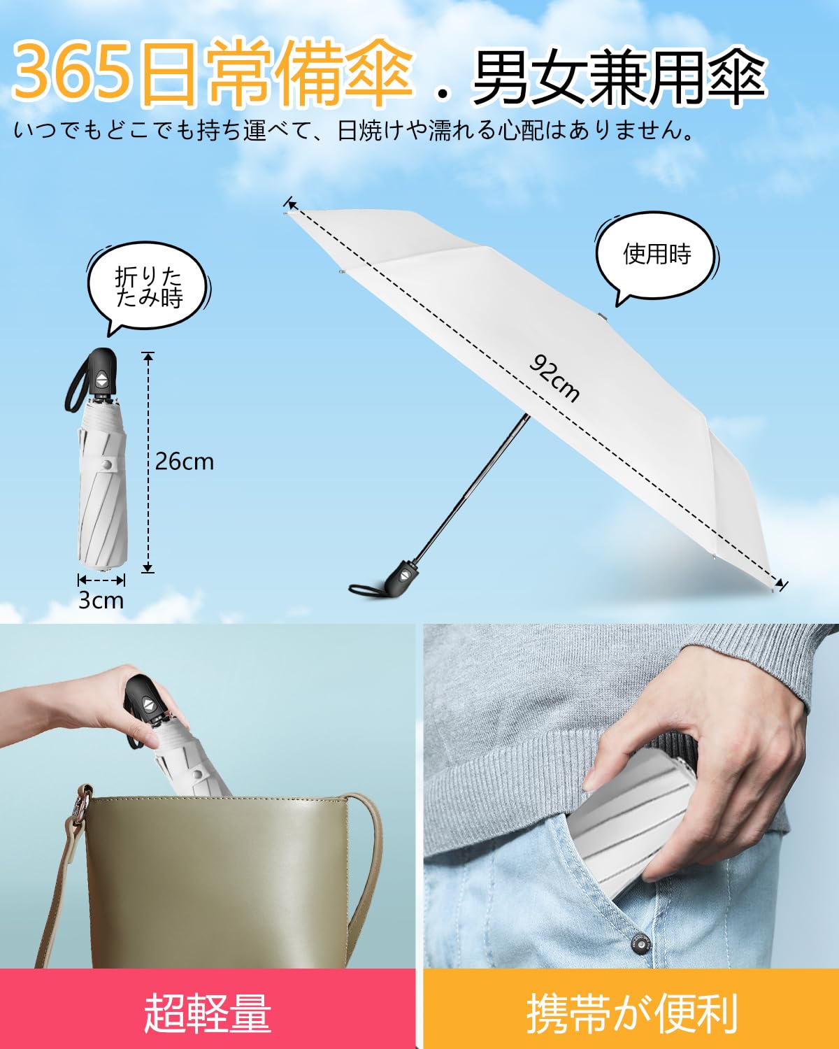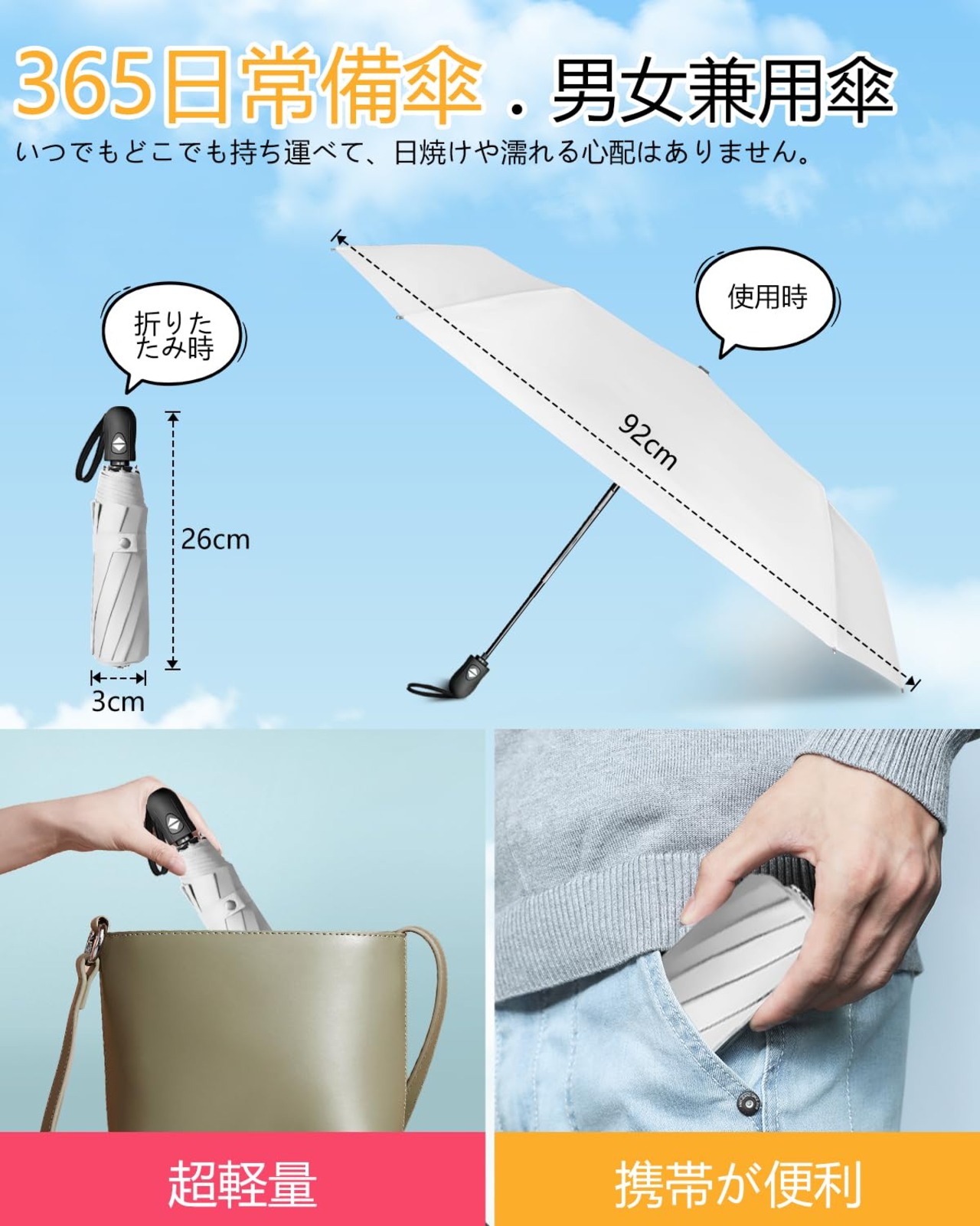 日傘 超軽量 UVカット率 100% 完全遮光 遮熱 ワンタッチ自動開閉 折りたたみ傘 コンパクト 折り畳み日傘 紫外線遮断 耐風撥水 晴雨兼用 携帯便利 母の日 父の日 収納ポーチ付き 通勤 通学 旅行 遠足 レディース/メンズ/子供/大人兼用。 ️「遮光率・UVカット率100%、UPF50+」日傘の傘布内側には、ナノ抗紫外線コーティングと遮熱ブラックコーティングが施されており、可視光線と紫外線を遮断します。 紫外線防止係数(UPF)は50+で、紫外線遮断率は99.9%以上、100%の遮光効果を実現し、熱放射に変換される太陽光線を遮断し、紫外線を効果的にカットします。 灼熱の夏でも、肌を紫外線から保護し、炎天下でも涼しさを楽しむことができます。 ️「六本傘骨&耐風撥水」この折りたたみ傘は6本の黒鋼製傘骨を採用し、耐久性、安定性、柔軟性を向上させ、長期間使用しても良好な性能を維持し、老化に耐えることができます。 傘布は310T高密度防水加工素材を使用しており、雨滴が玉のようにはじかれます。 その防水性は普通の傘よりも優れており、軽く振るだけで雨水を落とすことができます。 長時間使用しても雨水の浸透を心配する必要はありません。 ️「ワンタッチ自動開閉傘」ワンタッチ操作の自動開閉傘を採用しています。 片手で簡単に操作できるため、荷物やスマートフォンを持っている場合でも簡単に傘を開閉できます。 さまざまなシーンで使いやすさを実感できます。 傘の開閉ボタンは厳格な品質テストを経ており、毎回の操作が正確で、優れた耐久性を備えています。 「晴雨兼用&携帯便利&360日常備傘」この折りたたみ日傘は非常に軽量で、重量はわずか240グラムです。 コンパクトで携帯に便利で、専用の収納袋が付属しており、バッグに簡単に入れることができます。 車に常備するのも問題ありません。 また、日傘としてだけでなく、梅雨シーズンにも欠かせない優れたアイテムです!一年中使用できます。 「男女兼用 & 心遣いの選択」この製品は、使用者に快適な体験を提供することを常に目指しています。 傘面はシンプルで上品なデザインで、プリントは一切なく、男性も女性も気軽に使えるようになっています。 さまざまな祝い事で、友人や家族への贈り物として選べば、あなたのセンスの良さをアピールできるだけでなく、心のこもった贈り物として相手に伝わり、あなたの独特の高級感を感じさせることができます。 S000-K1010