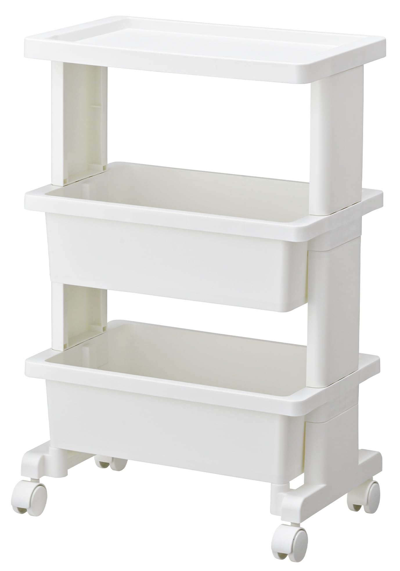 JEJアステージ(JEJ Astage) リセテーブルワゴン3段 ホワイト。 リビング、キッチン、バス、トイレ あらゆるシーンにマッチするサブデスク。 サイズ(重量)(約):製品/45×30×71.5cm(2,000g)、本体内寸/38.9×25.9×10.3cm。 素材・材質:ポリプロピレン。 生産国:日本。 組立式。 リビング、キッチン、バス、トイレ様々なシーンにマッチするサブデスク。 S000-K1010