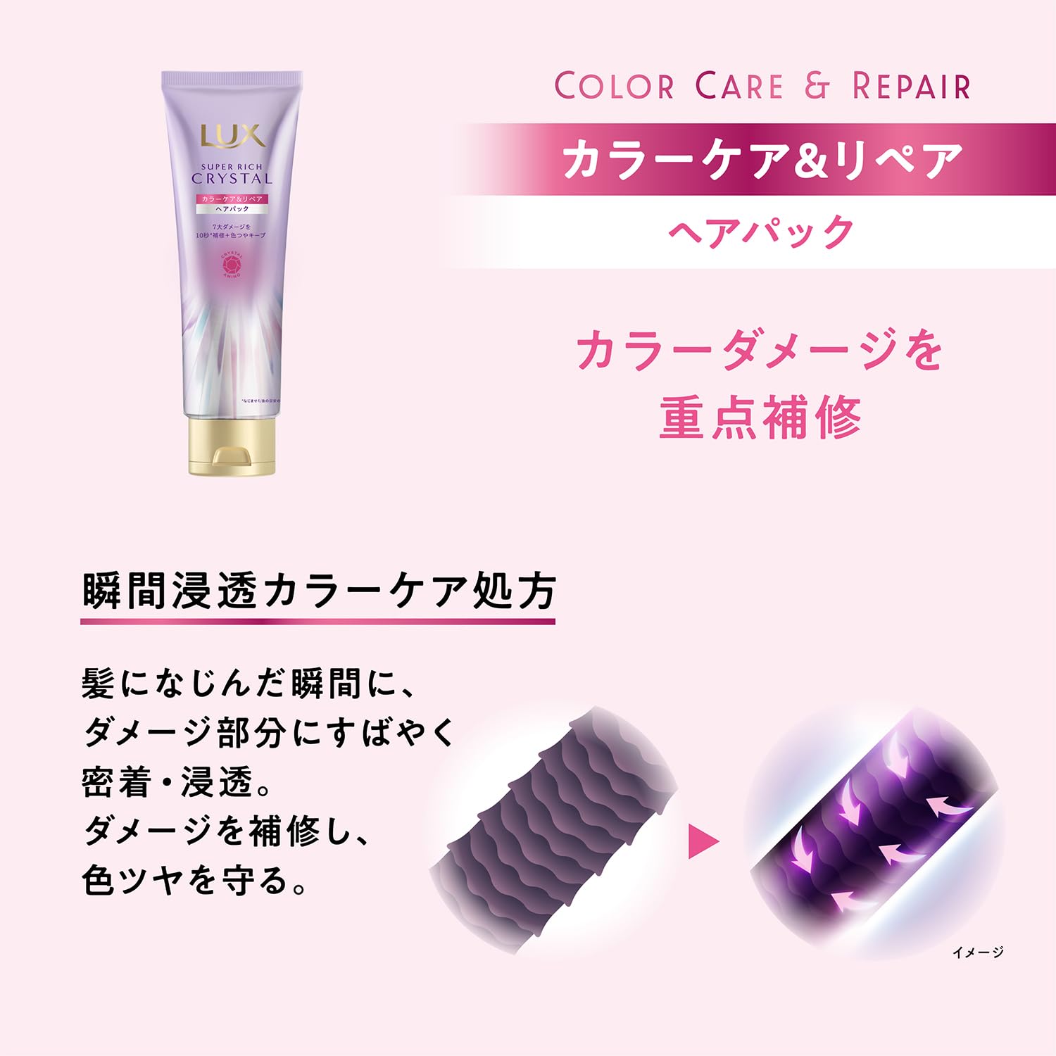 LUX(ラックス) スーパーリッチクリスタル カラーケア&リペア 洗い流すトリートメント ヘアマスク 本体 180g。 商品紹介 瞬間。 クリスタルツヤ髪へ。 色落ちしやすいダメージ髪向け。 色落ちおだやかに パッとあざやかなツヤ髪へ。 7大蓄積ダメージ*¹を10秒*²補修+色ツヤキープ。 髪になじんだ瞬間、ダメージ部分にすばやく密着・浸透。 シャンプー、コンディショナー、ヘアパック、ヘアオイルをシリーズ使いすることで、更に効果実感! *¹ UV、熱、乾燥、パーマ、ブリーチ、カラー、摩擦 *² なじませた後の目安の時間 原材料・成分 水、ステアリルアルコール、ベヘントリモニウムクロリド、グリセリン、ジメチコン、DPG、パルミチン酸セチル、アモジメチコン、(アクリル酸アミドプロピルトリモニウムクロリド/アクリル酸アミド)コポリマー、乳酸、グルタミン酸、トリカプリリン、アルギニン、(C12-14)s-パレス-7、EDTA-2Na、セトリモニウムクロリド、(C12-14)s-パレス-5、PEG-7プロピルヘプチルエーテル、ジメチルパルミタミン、トリデセス-12、カプリリルグリコール、酢酸、アスパラギン酸、トレオニン、セリン、プロリン、グリシン、アラニン、シスチン、チロシン、フェニルアラニン、ヒスチジン、リシン、バリン、イソロイシン、メチオニン、ロイシン、アルガニアスピノサ核油、クエン酸、ヒアルロン酸Na、加水分解ヒアルロン酸、ホホバ種子油、酢酸トコフェロール、トコフェロール、安息香酸Na、フェノキシエタノール、ブチルカルバミン酸ヨウ化プロピニル、ソルビン酸K、香料 使用方法 シャンプー、トリートメントのあと、軽く水を切り、適量(セミロングでマスカット大2粒程度)を毛先を中心に髪全体になじませ、すすぎ流してください。 すぐにすすいでも、しっかりケアすることができます。 毎日のご使用をおすすめします。 安全警告 頭皮に傷・はれもの・湿疹等、異常があるときは使用しない。 刺激等の異常が現れたときは、使用を中止し、皮ふ科医等に相談する。 目に入ったときは、すぐに洗い流す。 ※製品の特性上、保管条件によって製品がやわらかくなり中身が出やすくなることがありますが、品質には問題ありません。 瞬間。 クリスタルツヤ髪へ。 色落ちしやすいダメージ髪向け。 色落ちおだやかに パッとあざやかなツヤ髪へ。 7大蓄積ダメージ*¹を10秒*²補修+色ツヤキープ。 *¹ UV、熱、乾燥、パーマ、ブリーチ、カラー、摩擦 *² なじませた後の目安の時間。 髪になじんだ瞬間、ダメージ部分にすばやく密着・浸透。 S000-K9999