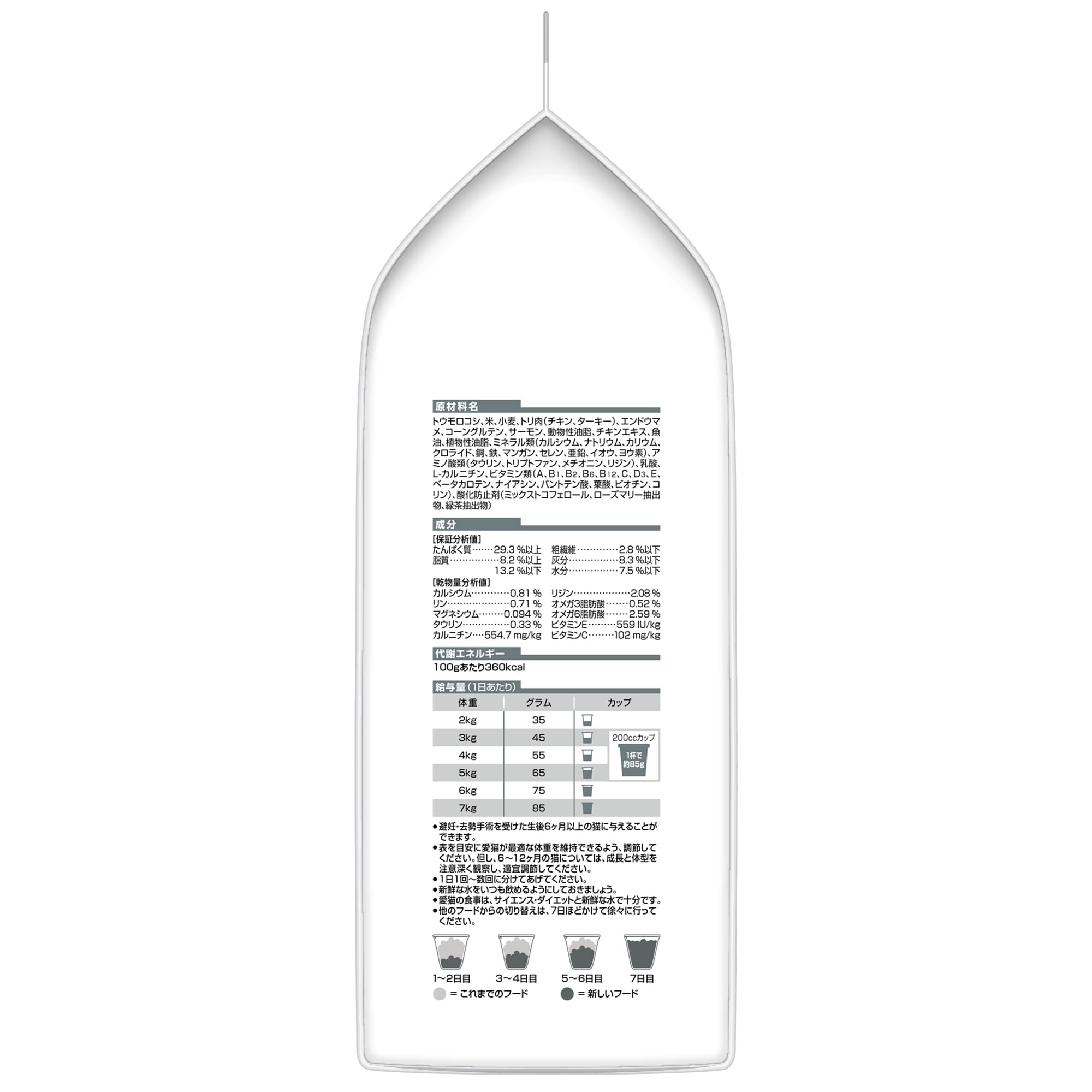 キャットフード サイエンスダイエット 避妊 去勢後 猫用 1~6歳まで サーモン&チキン2.5kg 成猫 お試し ドライ トライアル。 商品紹介 太りやすくなる避妊・去勢後の成猫の体重管理と健康をサポートする、栄養バランスに優れたキャットフードです。 適切なミネラルバランスで下部尿路の健康を維持します。 お試しにもおすすめ。 また当社「アダルト まぐろ 成猫用」ドライ製品と比べて、低脂肪(約45%減)・低カロリー(約11%減)で健康的な体重管理をサポート。 適切なレベルのリジンとカルニチンを配合し、筋肉を維持します。 ビタミンCとEを含む、科学的に証明された抗酸化成分によって本来の免疫力を維持。 自然派成分で製品の酸化を防止し、着色料や合成香料は含まれていません。 使用上の注意 給与量表を目安に愛猫が最適な体重を維持できるよう、適宜調整してください。 原材料・成分 トウモロコシ、米、小麦、トリ肉(チキン、ターキー)、エンドウマメ、コーングルテン、サーモン、動物性油脂、チキンエキス、魚油、植物性油脂、ミネラル類(カルシウム、ナトリウム、カリウム、クロライド、銅、鉄、マンガン、セレン、亜鉛、イオウ、ヨウ素)、アミノ酸類(タウリン、トリプトファン、メチオニン、リジン)、乳酸、L-カルニチン、ビタミン類(A、B1、B2、B6、B12、C、D3、E、ベータカロテン、ナイアシン、パントテン酸、葉酸、ビオチン、コリン)、酸化防止剤(ミックストコフェロール、ローズマリー抽出物、緑茶抽出物) 使用方法 給与ガイドラインをお確かめの上給与ください。 太りやすくなる避妊・去勢後の成猫の体重管理と健康をサポートする、栄養バランスに優れたキャットフード。 適切なミネラルバランスで下部尿路の健康を維持します。 栄養バランスに優れた製品で、太りやすい避妊・去勢後の成猫におすすめ。 脂肪分約45%オフ・カロリー約11%オフ*で、太りやすくなる避妊・去勢後の体重管理をサポート *当社「アダルト まぐろ 成猫用」ドライ製品との比較。 適切なレベルのリジンとカルニチンを配合し、避妊・去勢した猫の健康な筋肉を維持。 マグネシウムの量を調整し、適切な栄養バランスで、ストルバイト尿石に配慮。 S600-K9999