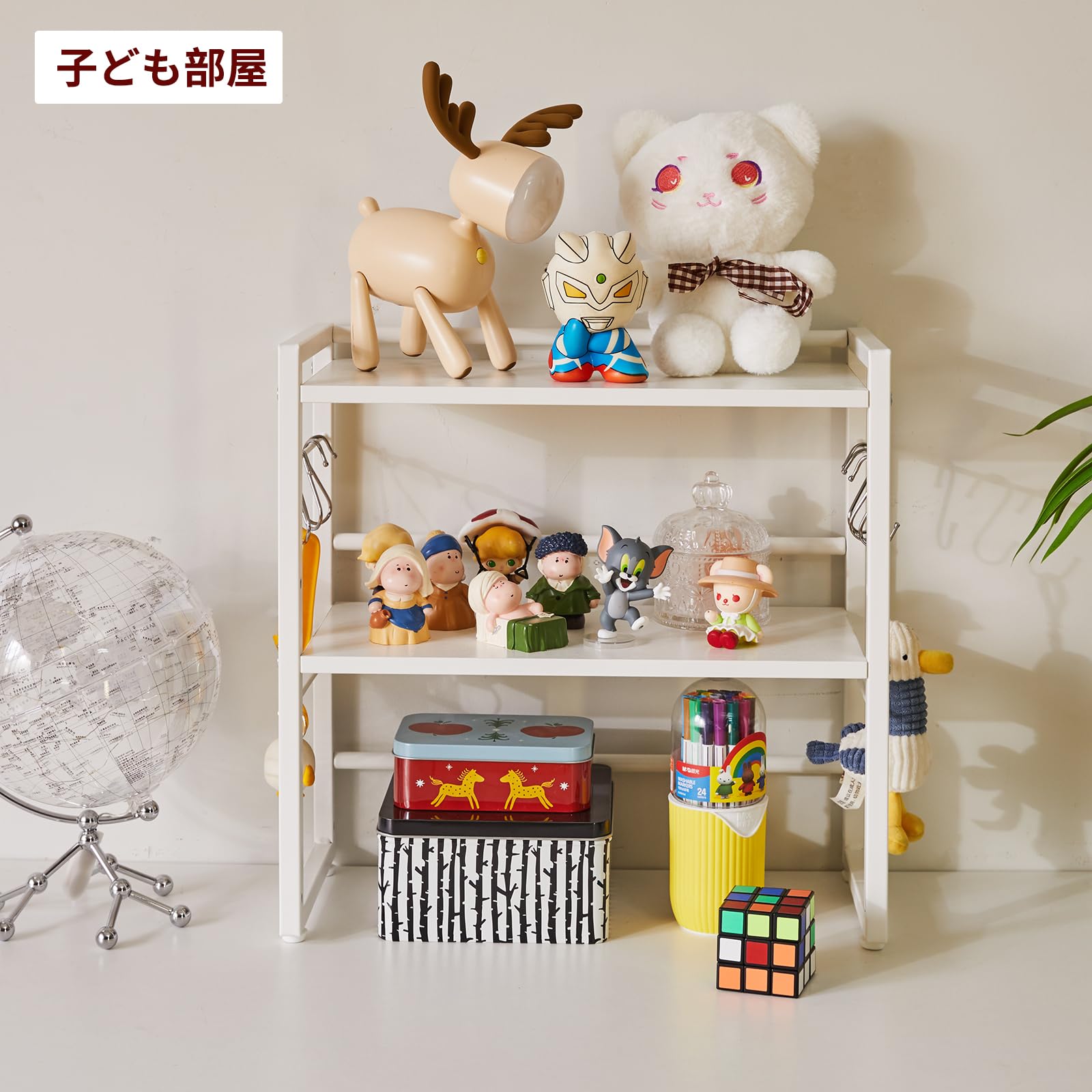 Aibiju 卓上 本棚 ラック デスク収納 棚板高さ調節可 2段 机上台 キッチン収納 調味料ラック フック付き 43*20*43cm ノート パソコン台 卓上 白 YD-DSR001W。 高さ調節可能:卓上本棚の上段・下段はそれぞれ高さを調整することができ(4つの高さがあります)、書籍、ノートパソコンなど、さまざまな高さのものに適しています。 必要に応じて仕切り板を1段だけ取り付けることもできます。 デザインと素材: 頑丈な金属フレームと上質な板材のシンプルな組み合わせは、板材には木質の木目調があり、清潔で明るく、傷に強く、掃除しやすい。 美しく実用的な卓上本棚を作り、ファッションの中にヴィンテージな雰囲気を漂わせています。 負荷能力:デスクシェルフのサイズは幅43×奥行20×高さ43cm、材料は鋼材とパーティクルボードです。 組み立てが容易で、単層最大荷重は20kg。 また、6つのフックが付属しており、イヤホンや鍵、皮むき器、栓抜きなどの小物を収納できます。 多機能な卓上ラック:文房具、ファイル、化粧品、調味料、pc、パソコンなど、様々なアイテムを自由に収納できる多機能な卓上ラックです。 机上台は、リビングルーム、書斎、寝室、洗面所、玄関や台所など、多くの場所で使用できます。 S000-K9999