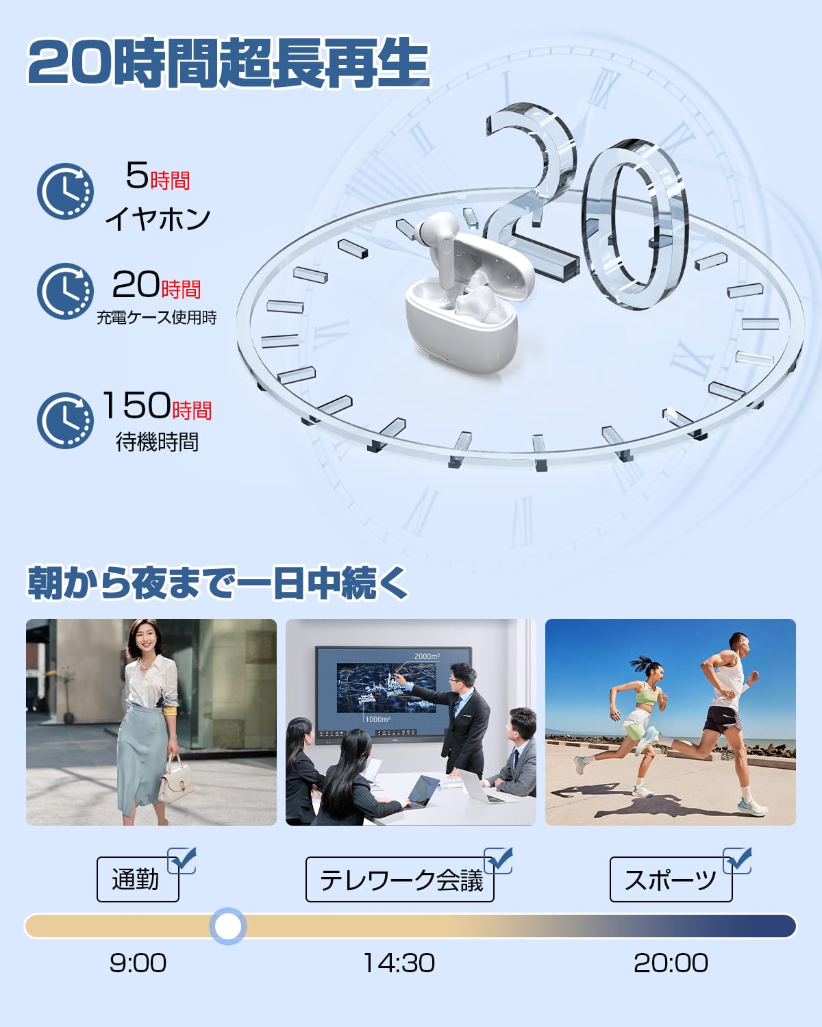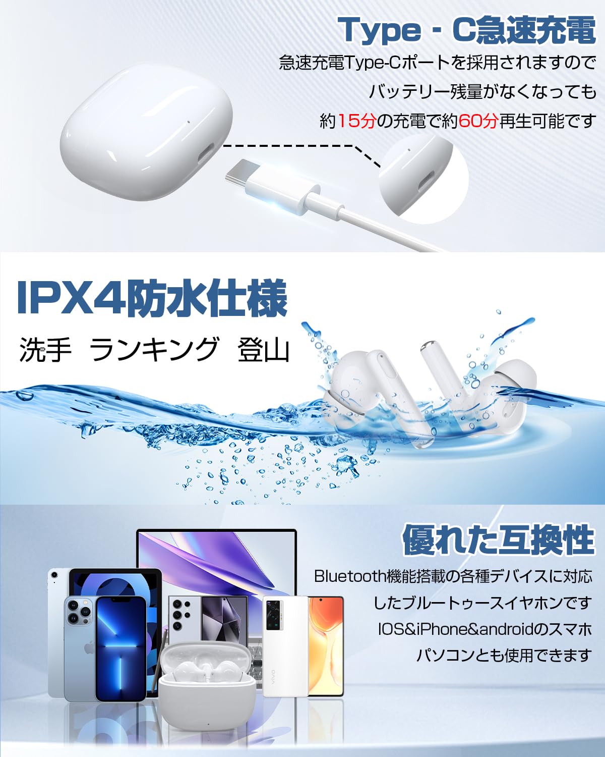 イヤホン bluetooth ワイヤレスイヤホン Blueooth 5.4 ブルートゥースイヤホン Type-C急速充電 ENC通話ノイズキャンセリング 自動ペアリング 小型/軽量 快適な装着感 マイク付き IPX4防水/防滴 Hi-Fi音質 超軽量設計 タッチ式音量調整 iOS/Android対応 コンパクト/テレワーク/通勤/音楽/通学/スポーツ/WEB会議。 最新Bluetooth 5.4搭載!自動ペアリングで手間いらずの完全ワイヤレスイヤホン 当社の完全ワイヤレスイヤホンは、最新Bluetooth 5.4技術を採用し、10mの広範囲接続を実現。 高速かつ安定した伝送で、音楽や通話を途切れず楽しめます。 さらに、低電力消費設計で長時間使用可能。 初期設定後は、ケースから取り出すだけで自動ペアリングが完了するので、面倒な操作は一切不要です。 ENCノイズキャンセリング機能を搭載し、通話中の周囲の雑音を効果的にカット。 クリアな会話が可能で、音楽もHi-Fi高音質で楽しめます。 13mm大口径スピーカーにより、深みのあるベースとクリアな高音を再現。 まるでライブ会場にいるような臨場感を味わえます。 軽量3gのコンパクト設計で、耳にフィットしながらも圧迫感ゼロ。 長時間の使用でも快適です。 充電ケースを含めてもたったの45gと軽量で、ポケットに入れてどこへでも気軽に持ち運べます。 充電はType-C急速充電対応で、15分の充電で約60分再生可能。 さらにIPX4防水仕様なので、汗や小雨にも強く、スポーツやアウトドアでも安心です。 スマートタッチコントロールで、音楽の再生/停止、曲送り/戻し、通話の応答/終了、音量調整などが指先ひとつで簡単操作。 磁気式充電ケースから取り出すだけで自動起動し、すぐに使える便利さです。 「手軽さ」「高音質」「快適性」を追求した当社のワイヤレスイヤホンで、ストレスのない音楽ライフを始めましょう!。 【最先端の技術と高機能性 】当社のワイヤレスイヤホンは、Bluetooth 5.4を搭載し、安定した接続と高速データ転送を実現。 接続が途切れず、スムーズに音楽を楽しめます。 デュアルマイクとENC 技術により、周囲のノイズを効果的に除去。 通話時も明瞭な音声で会話がスムーズに。 Hi-Fiクオリティの高品質サウンドを実現し、2.40 - 2.48 GHzの周波数帯域で音楽の細部まで鮮明に再生。 技術マーク認証を取得し、音楽愛好者にも満足いただける音質です。 さらに、AACとSBCコーデックに対応し、スマートフォンなどの機器と組み合わせて最適なコーデックを選択可能。 より高い互換性と優れた音質を提供します。 このイヤホンは、最新技術を詰め込みながらも、使いやすさと高品質なサウンド体験を両立。 日常使いから通話、音楽鑑賞まで、あらゆるシーンで活躍します!。 【軽量設計と快適な装着感 】当社のワイヤレスブルートゥースイヤホンは、軽量設計が特徴です。 1 個のイヤホンの重量はわずか 3g で、耳に負担をかけず、長時間の着用にも快適です。 持ち運びも簡単で、外出先でもいつでも音楽を楽しめます。 コンパクトなデザインで、ポケットやバッグに入れて持ち歩くのに最適です。 【長時間使用可能な充電性能 ⏳】長時間の連続再生: イヤホン本体を完全に充電すると、約 5 時間の連続通話や音楽再生が可能です。 また、充電ケースを完全に充電すると、イヤホンを約 5 回充電できます。 合計で約 20 時間の音楽再生が可能で、長旅や日常の使用にも十分対応できます。 ️短時間充電で長時間使用: 15 分の充電で約 1 時間の使用が可能で、急ぎの時にもすぐに使える便利な機能です。 長時間の待機時間: 待機時間は約 150 時間で、充電せずに長期間保管しても安心です。 【便利な機能と広範な互換性 】自動ペアリングとスマートタッチコントロール: 磁気式の充電ケースからワイヤレスイヤホンを取り出すだけで、自動的に電源がオンになり、接続済みの機器に自動接続します。 また、スマートタッチコントロールで、曲の次へ / 前へ、音楽の再生 / 停止、着信の受話 / 終了 / 拒否、電源のオン / オフ、音量調整などの基本操作が簡単に行えます。 広範な機器互換性: Bluetooth 機能を搭載したあらゆる機器に対応しており、iOS、iPhone、スマートフォン、コンピュータ、タブレットなどと接続できます。 【防水機能とシンプルなデザイン、そして充実したサポート体制 ️】IPX4 防水仕様: IPX4 の防水規格を備えており、汗や小雨にも強く、ジムでのトレーニングや屋外での運動中でも安心して使用できます。 ️️️シンプルでスタイリッシュなデザイン: シンプルなデザインがモダンでスタイリッシュで、いかなるスタイルにも合わせやすいデザインです。 充実したアフターサービス: 製品に問題や欠点がある場合、私たちは全力を尽くしてサポートいたします。 いつでもお問い合わせください。 S000-K1009