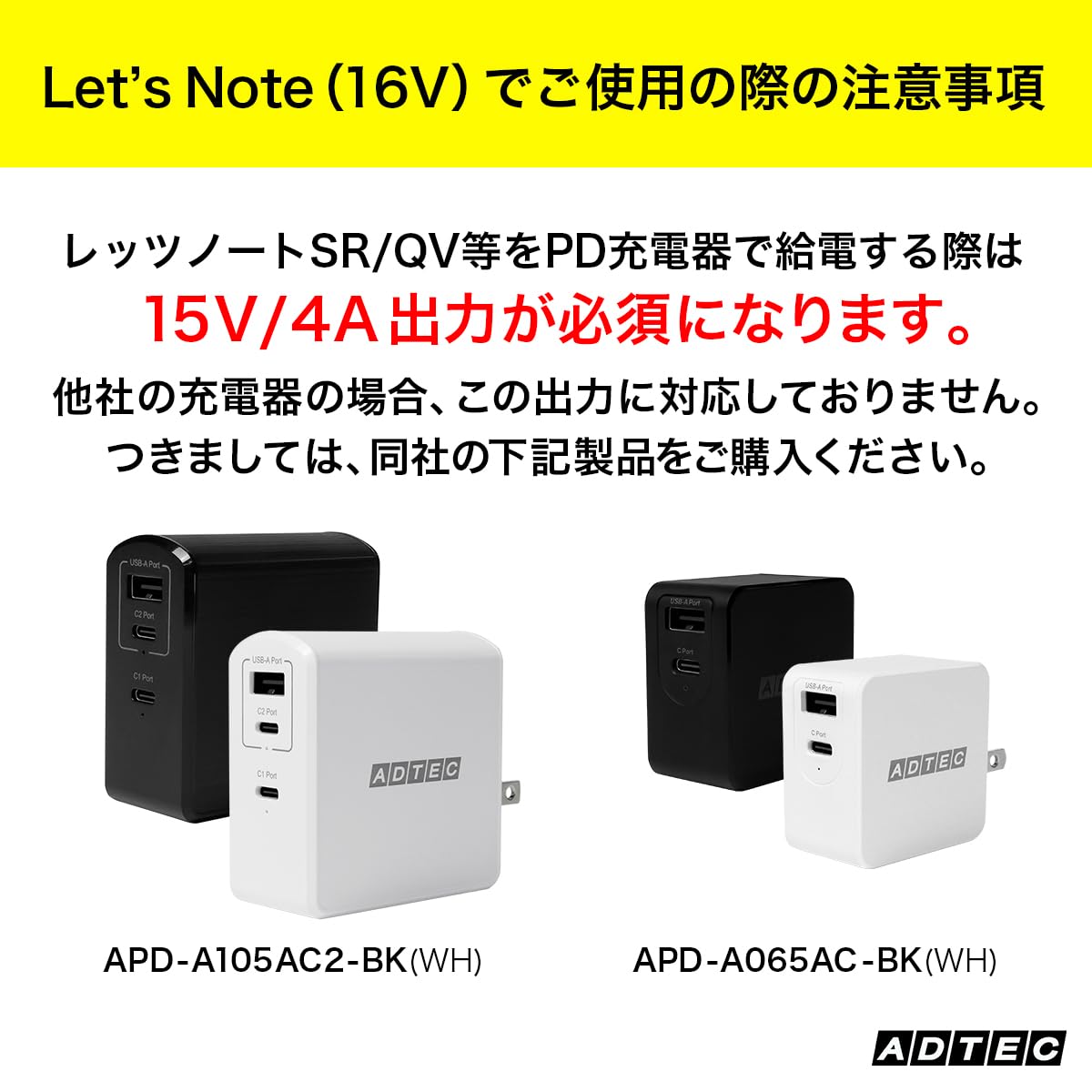 アドテック Pnasonic HP Lenovo NEC 対応充電ケーブル 15V~16V,19V~21V対応 eMarker搭載 1.2m PD充電 95W対応(USB Type-C/5.5mm-2.5mmコネクタ)トリガーケーブル APC-A095CM-5525P。 Panasonic/Let’ノート対応コネクタ採用モデル。 奥まったコネクタでも接続可能。 15-16Vモデル、19-20Vの電圧にeMarkerが自動調整 便利な2種類の電圧対応の トリガーケーブル。 多くのノートパソコンに使用可能な5.5mm/2.5mmプラグ専用モデル。 当社製PD充電器と使用する事でコンパクトに持ち運び可能。 パナソニック Let'sNoteに最適化された設計 ・動作タイミングを調整 ・ケーブルを纏めるための結束バンド付属。 レッツノート使用時に赤ランプが点灯する場合は電流不足となります。 省電力設定を「高パフォーマンス」から「省電力」に変更をして試して下さい。 S000-K1010