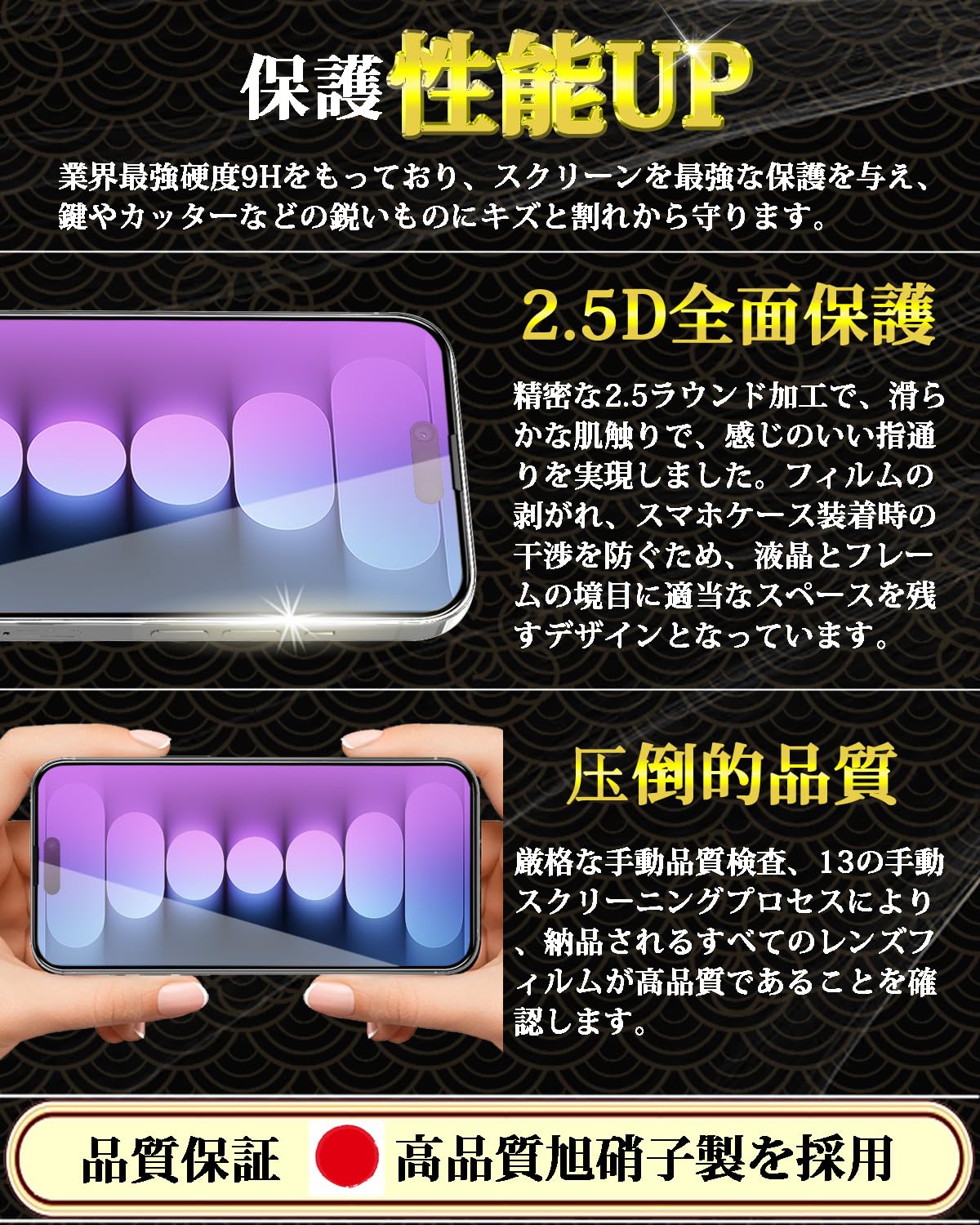 対応 iPhone15 ブルーライトカット ガラスフィルム iPhone 15 ガラスフィルム 目の疲れ軽減 全面保護フィルム 日本旭硝子製 【ガイド枠付き・1枚】硬度9H 指紋防止 飛散防止 貼り付け簡単 スクラッチ防止 気泡防止 アイフォン15 用 液晶強化ガラス 6.1インチ。 【ブルーライトカット機能・目の疲れを軽減】ブルーライトへの対策として販売されているのがブルーライトカットガラスフィルムです。 ガラスフィルム は先進ブルーライトカット反射技術によりブルーライトを大幅にカットでき、目に掛かる負担を軽減し、色素沈着を防止、効果的に近視を予防でき、ディスプレイを長時間眺める方に効果を発揮します。 (正面から見るとブルーライトの部分が吸収され、三原色の赤と緑との割が増えて、淡い黄色に見える。 )。 【旭硝子素材採用!対応機種】iPhone 15 ブルーライトカット ガラスフィルムは日本製の旭硝子を素材として採用し、業界最高レベルの9H硬度を持ち、耐衝撃性と耐傷性に優れています。 衝撃吸収の特性により、転落とかの外力からスマホ画面への衝撃ダメージを最小限に抑えることができます。 【気泡ゼロ・貼付け簡単】気泡防止加工が施されているので、気泡が入りにくい。 万が一気泡が入ってしまっても時間が経てば徐々に抜けるので 美しい仕上がりに。 自動吸着機能あり、ガラスを液晶画面スクリーンに軽く押すだけで自然に画面に吸着できます。 初心者やフィルム貼りが苦手の方にも安心です。 【指紋防止・撥水撥油】疎水性と疎油性のクリア レイヤーでコーティングされたガラスは、 指紋による汗や油分の残留を防ぎ、携帯電話の液晶画面をきれいに保持します。 フィルムに汚れ、水滴、ほこりがある場合は、簡単に拭き取ることができます。 S000-K9999