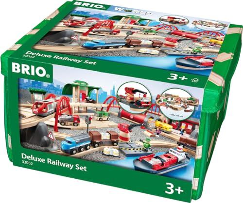 BRIO (ブリオ) WORLD レール&ロードデラックスセット 対象年齢 3歳~ (電車 おもちゃ 木製 レール) 33052。 【BRIO WORLD】境界線も限界もありません。 つきることのない可能性があるだけ。 いつでもなりたいものになれ、どこにでも行くことができます。 組み立てて組み直して、創造して導く。 ブリオの世界には6つのテーマがあり、全て遊びの中でつながって、自由に移動することができます。 【デラックスセット】駅、橋、トンネル、踏切、坂そしてクレーン。 お子様が大好きな情景がすべて入った最上級のセットで、すべてつなげるとタタミ1畳分を超す大型のレイアウト。 お片づけが出来るコンテナボックス入り。 すべての要素が入っているので、あとから何を追加したらいいかわからない、という方にもお勧めです。 ブリオで遊んでいると子どもたちの創造力を刺激し、論理的な思考と運動能力を育みます。 【最上級クラスの特別なセット】お子様に人気の駅・坂・トンネル・踏切・クレーンの5大情景パーツがすべて揃っています。 フィギュアはそれぞれの列車や車両に載せることができます。 広げるとプレイマットになる収納ボックス入り。 【セット内容】車両×11、駅×2、橋×3、トンネル、クレーン、船、他 (全87ピース)【対象年齢】3歳以上【対象性別】男女共用【電池種別】LR44×2個 (お試し電池付属)【サイズ】レイアウトサイズ:W1135xD730mm / パッケージサイズ:W386xD327xH232mm。 【BRIOのおもちゃ】ブリオは1884年に創立されたスウェーデン王室御用達の木製おもちゃブランドで、世界中で親しまれています。 ブリオの玩具は知育玩具であると同時に遊びながら楽しい想像力を無限器かきたてるおもちゃで何世代にもわたってお楽しいただけるよう丹念に作られています。 ヨーロッパの基準より高い基準で試験を行い、FSC森林管理認証を受けた木材を使用しています。 S000-K9999