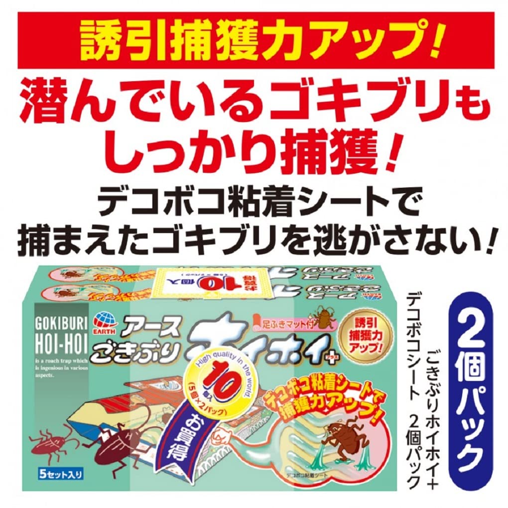 ごきぶりホイホイ+デコボコシート [5セット入x2個パック]。 商品紹介 誘引・捕獲力がアップしました。 。 ビーフ、えび、野菜などの素材をそのまま再現した強力誘引剤だから、潜んでいるゴキブリもついフラフラ引き寄せられます。 足ふきマットで、粘着力を弱める油分、水分をしっかり吸収し、ゴキブリの手足や体がめり込むデコボコ粘着シートで、捕まえたゴキブリを逃がしません。 タテ置きもできて、水気のある場所でも設置できる耐水性。 使用上の注意 子供やペットが触れないように注意して設置してください。 強力誘引剤と粘着剤は共に殺虫成分を含んでいませんが、誤って食べたりしないようにしてください。 本品の粘着剤に手を触れないでください。 万一、粘着剤が手や髪の毛、ペット、衣服、床等についたときは、サラダ油や天ぷら油などでたんねんにふき取り、石けんや洗剤を用いてよく洗ってください。 廃棄の際は、そのまま燃えるゴミとして処理してください。 子供の手の届かないところに保管してください。 安全警告 この製品は子供やペットの手の届かないところに置いてください。 また、水気のある場所で使用する場合は、安定した場所に設置してください。 ご注意(免責)>必ずお読みください お時間いただく場合がございます。 ご理解の程よろしくお願い致します。 商品サイズ(幅×奥行×高さ):222mmx111mmx72mm。 内容量:5セットx2。 ビーフ、えび、野菜などの素材をそのまま再現した強力誘引剤だから、潜んでいるゴキブリもついフラフラ引き寄せられる。 デコボコ粘着シートと足ふきマットでがっちり捕獲。 タテ置きもできて、水気のある場所にも設置できる耐水性。 S350-K9999