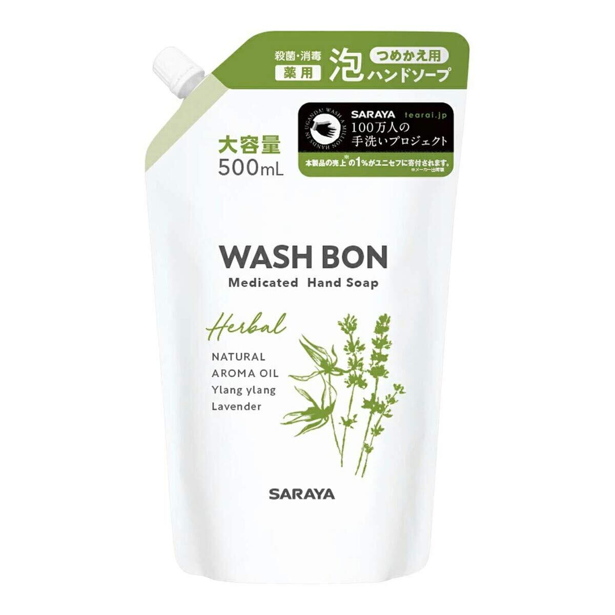 【サラヤ】 ウォシュボン ハーバル薬用ハンドソープ 詰替用 500ml ×5個セット。 手を洗うことで殺菌消毒ができる、ヤシの実生まれの植物性泡ハンドソープ。 洗面やキッチンなど場所を問わず置いていただけます。 天然精油100%の香り(イランイラン&ラベンダー)がするふんわり泡をお楽しみください。 S000-K9999