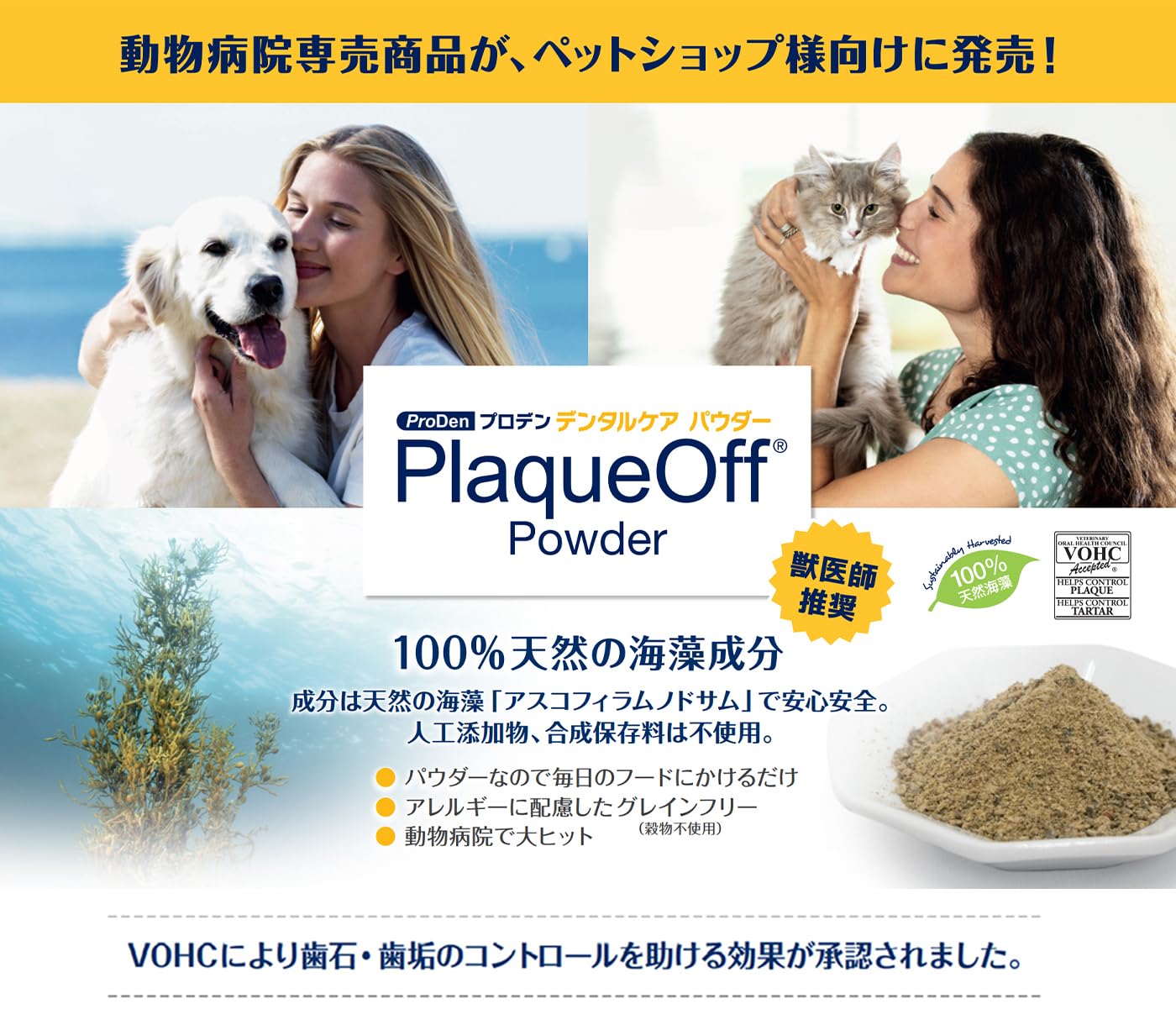 ライトハウス【プロデン】デンタルケア パウダー 犬用 40g デンタルケア【ご飯にかけるだけ】。 商品紹介 デンタルケアパウダーを毎日の食事にかけるだけです。 歯垢、歯石の付着を押さえ、口臭を軽減します。 原材料・成分 【原材料】海藻(アスコフィラムノドサム)【栄養成分〈100g中〉】たんぱく質 5%以上、脂質 2%以上、粗繊維 8%以下、粗灰分 22%以下、水分 14%以下【エネルギー】0.17cal/1杯 使用方法 通常の食事にかけて与えてください。 1日あたりの給与量:体重10kg以下:付属のスプーン1杯、体重10kg~25kg:2杯、体重25kg以上:3杯・甲状腺疾患の場合と妊娠時はご使用をお控えください。 ・子供の手の届かない場所に保管してください。 ・本品は、栄養摂取を目的とした製品ではございません。 ・湿気を避けて冷暗所に保存してください。 安全警告 甲状腺疾患の場合と妊娠時はご使用をお控えください。 子供の手の届かない場所に保管してください。 湿気を避けて冷暗所に保存してください。 パウダー状で噛む事が苦手なシニアにも最適です。 S000-K9999