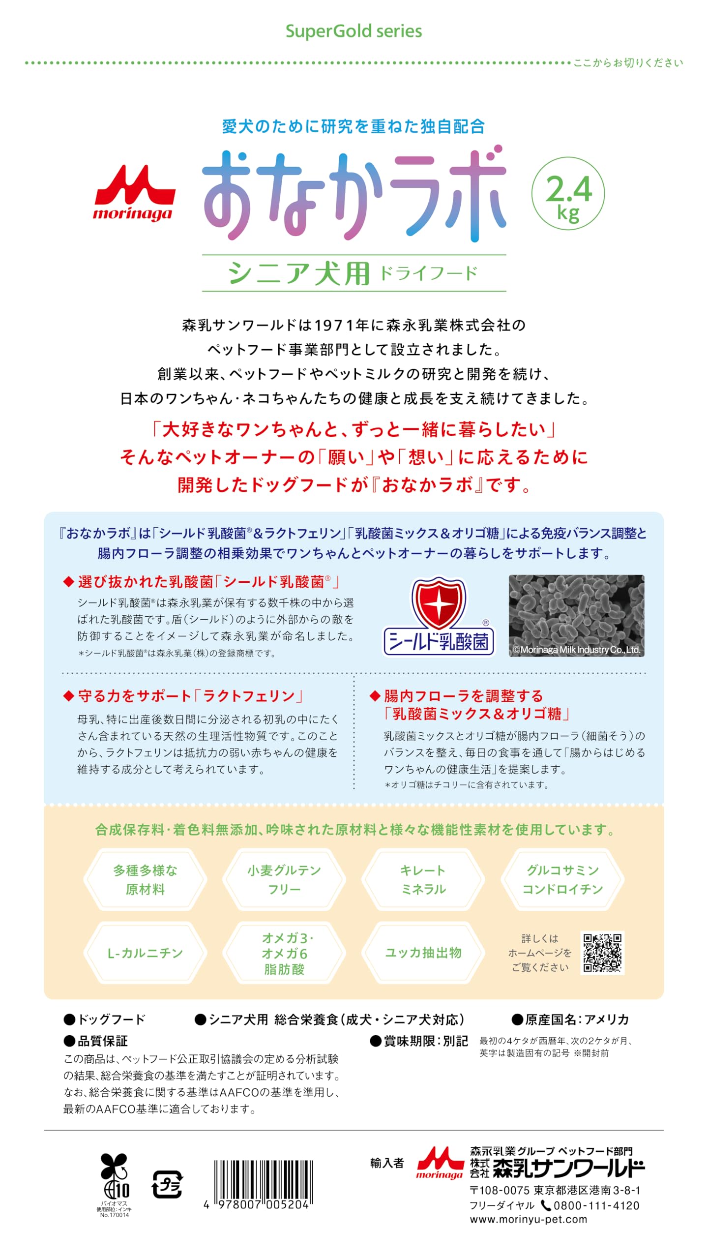 森乳サンワールド スーパーゴールド おなかラボ シニア犬用 2.4kg。 ワンちゃんのために研究を重ねた、腸内環境をサポートする独自配合。 S600-K9999