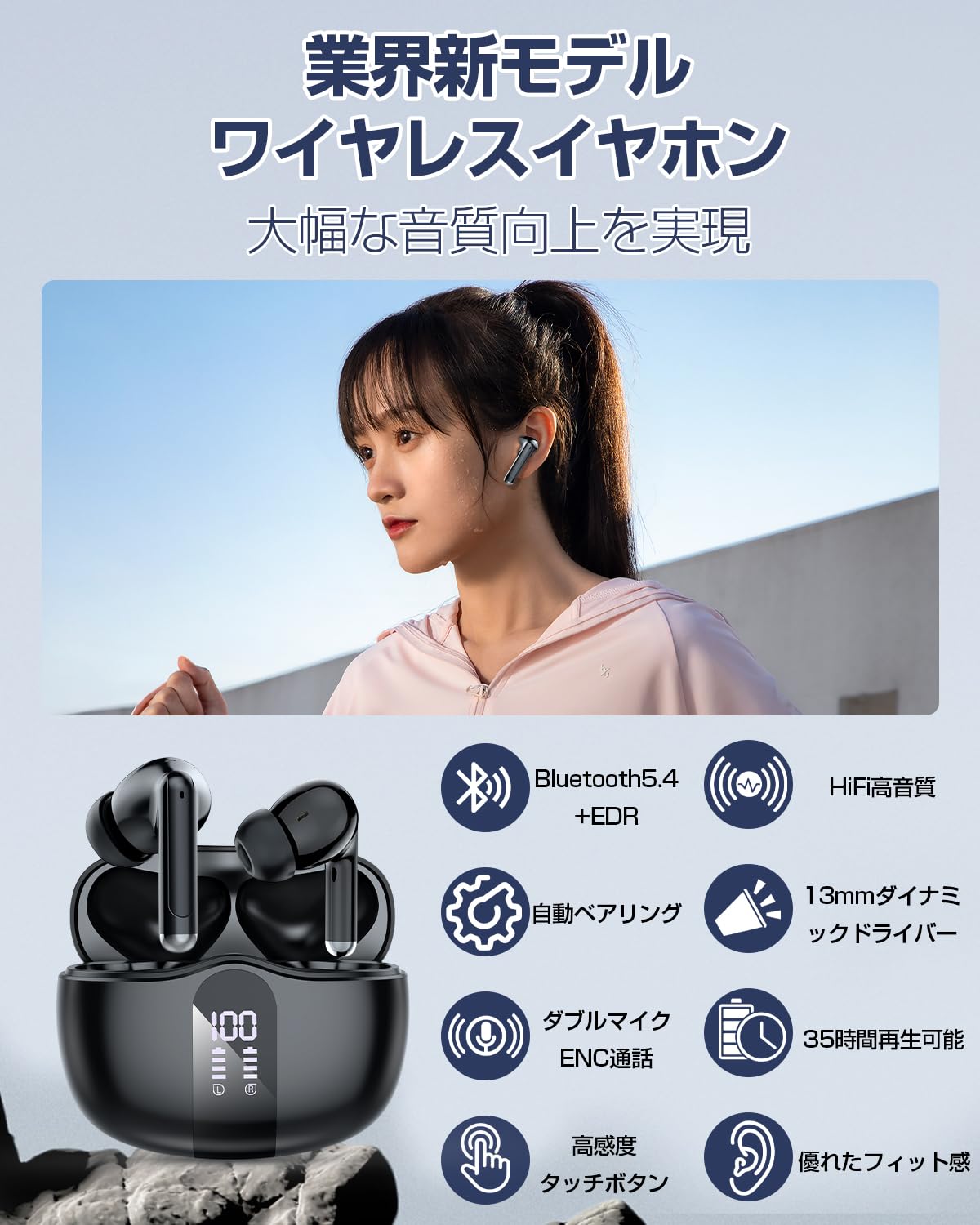 イヤホン bluetooth ワイヤレスイヤホン 【2025究極臨場感モデル ・クリアな音】ブルートゥース イヤフォン Bluetooth5.4 LEDディスプレイ ダブル マイク ENC CVC8.0通話 ノイズキャンセリング Hi-Fi音質 ハンズフリー通話 ぶるーとぅーす カルナ型 35時間音楽再生 iPhone/Android 適用 通勤/通学/スポーツ/ゲーム (ブラック)。 【業界モデルBluetooth5.4技術&低遅延】ワイヤレスイヤホン新型モデルが登場します!!!最新型開発のワイヤレスイヤホンはBluetooth5.4技術とEDRチップを搭載されて、よりクリアに質感、より高速なデータ転送速度、より低電力消費とより安定した接続を実現しました。 従来のbluetoothイヤホンの通信なし、音飛び、音切れ、遅延、電力消費早いの問題を改善しただけでなく、満員電車、バスなど電波のある場所でも安定した通信が維持できます。 ゲーム中でも、いつでも安定して接続でき、途切れ、遅延などの心配がありません!。 【高音質ドライバー&ダブルマイクENC通話】 13mmの大口径ドライバーユニットを搭載し、明瞭の高音域から、透明な中音域、豊かな低音域までフルカバーし、サウンド本来の質感を復元し、原音を忠実に再現できます。 コンサート会場の中にいるかのように、音楽がゆっくりと耳に伝えてくるので、リアルな臨場感で音楽に浸ることができます。 ちなみに、高性能マイクとノイズキャンセリングが搭載され、周りの騒音をカットし、自分の発話だけに焦点を当て通話相手にはっきりと伝わるため、通話品質が優れています。 【バッテリー残量一目瞭然&長時間音楽再生】LED残量ディスプレイが付いて、充電ケースのバッテリー残量はLEDディスプレイに100%から1%まで表示され、充電ケースは充電中でLEDディスプレイは自動的に点滅し、充電完了はLEDディスプレイが100%を表示されます。 大容量の320mAhリチウム電池を持ち、満充電の状態でイヤホン単体が最大6時間の連続音楽再生が可能です。 充電ケースと併せて最大30時間ので、1日中電池切れの心配がありません。 Type-Cポートを採用されますので、充電のスピードが従来のUSBより著しく早くなりました。 【快適なフィット感&コンパクト軽量】人間工学に基づいて柔らかなシリコン設計を採用し、3種類のイヤーチップ(S/M/L)が付属して、異物感がほとんどなくて、耳の形に合わせて遮音効果も両立しています。 片耳が4.1gなので、羽のように軽く、耳に負担がかけなく、長時間装着していても耳が痛くなりません。 充電ケースの重量41gと、軽量・小型化を実現し、持ち運びにも便利です。 外出時にポケット、カバンに入れることができますので、セットでどこに持ち歩いても邪魔になりません。 S000-K9999
