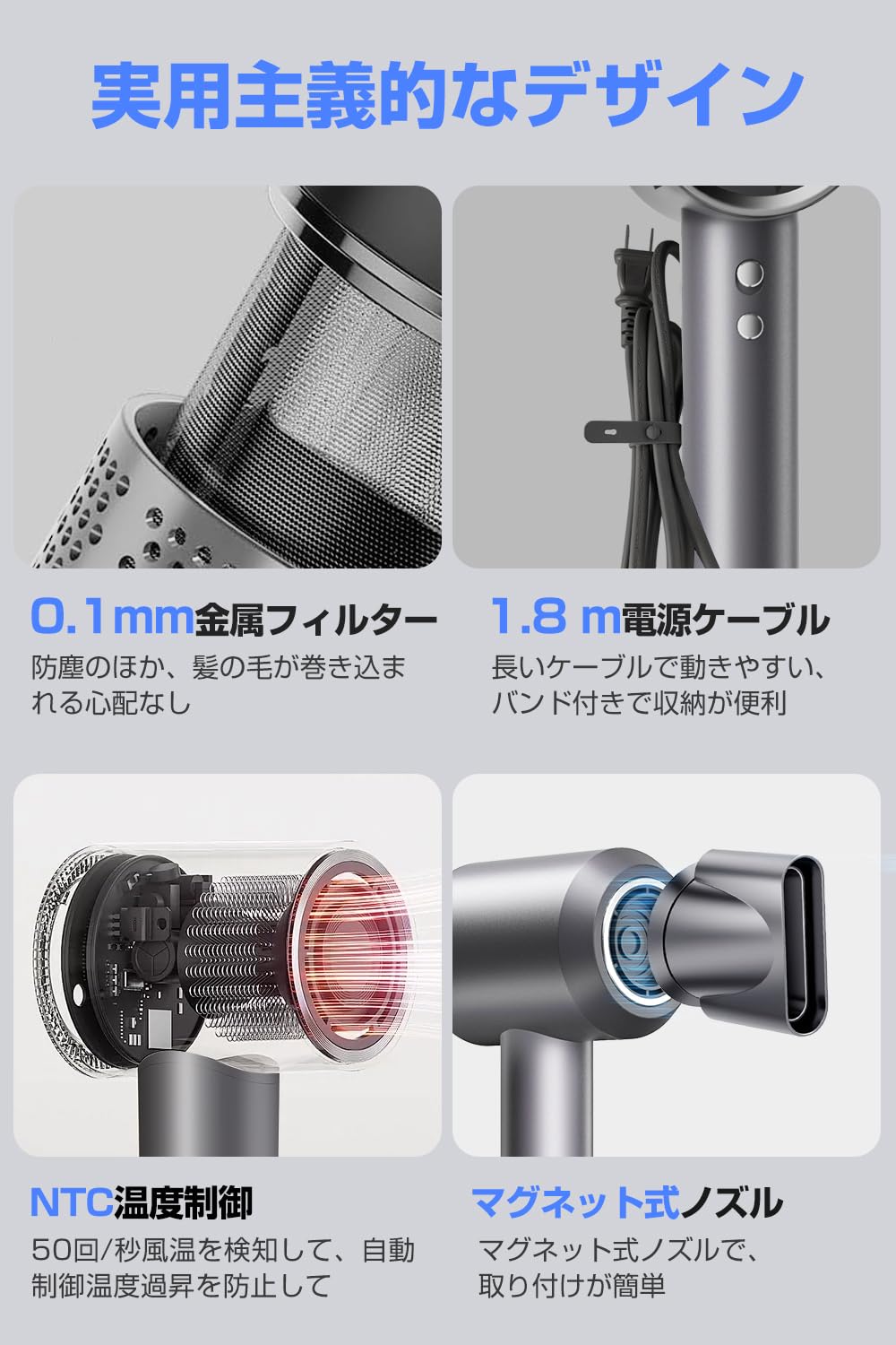 【斬新デザイン・3億マイナスイオン・ワンタッチ冷風】 ドライヤー ヘアドライヤー 1300W超大風量 速乾 ブラシレスDCモーター 温冷風ワンタッチ切替 美髪 ヘアケア NTC温度制御システム 過熱防止 軽量 低騒音 持ち運び便利 3億高濃度マイナスイオン 静電気除去 美容師監修 ヘアサロン/家庭用/旅行用 PSE認証済み 日本語説明書/マグネティックノズル付き (グレー)。 【1300W大風量・本当の速乾】本製品は、純銅製のブラシレス横置きモーターを搭載し、1300Wの大出力を実現しています。 これにより、真の意味での大風量による速乾が可能となります。 さらに、ヘッド部分には環状風口デザインを採用しており、従来の集中型とは異なり、大面積で風を送ることができます。 この設計により、髪へのダメージを大幅に軽減し、同時に広範囲の髪を一度に乾かすことができます。 その結果、全体的なスタイリングがより自然な仕上がりになります。 朝の通勤前のスタイリングや、洗髪後の乾燥など、どちらも簡単にお使いいただけます。 【ご注意:商品は電源を入れてからパワーオンにする必要があります。 】。 【ワンタッチ冷風・手軽にスタイリング】产品は、迅速な乾燥と日常的なスタイリングを求める方々に主に向けて提供されています。 この製品は、ワンタッチで温風と冷風を切り替えることができ、頻繁に温度を調整する手間を省き、よりスムーズにスタイリングができます。 また、このドライヤーは、3段階の風速調整と4段階の温度調整が可能で、あらゆるニーズに対応します。 【商品に異常な作動がありましたら、不良品の可能性が高い、弊社までご連絡ください、迅速に対応させていただきます。 】【ご注意:商品には風速と温度の調節が可能です。 左は風速で、右は温度。 それぞれ3段階の調節ができます。 】。 【3億マイナスイオン・ 実用主義のデザイン】この高速ドライヤーは、3億個のマイナスイオンを放出する装置を搭載しており、髪を乾かしながら髪のツヤと滑らかさを守ります。 静電気を除去し、スタイリングをより長持ちさせ、完璧な仕上がりを実現します。 製品は、ユーザーの生活をより便利にするために多くの細部に改良が加えられています。 磁気吸着式のノズルは取り付けが簡単で、ダストフィルターはホコリの侵入を防ぎ、使用寿命を延ばすとともに、髪の毛がドライヤーに巻き込まれるのを防ぎます。 付属のケーブルバンドは、コードをより便利に収納できるようになっています。 すべては、ユーザーがより快適に生活できるように設計されています。 【恒温装置ヘアケア・低騒音軽量】この製品は、温度を毎秒50回監視する恒温装置を搭載しており、過熱の可能性を完全に排除しています。 安心して安全に使用できる製品です。 このドライヤーは新しい設計を採用しており、空気の集中力を高め、風量を増加させると同時に騒音を大幅に低減します。 横置きのモーターにより、製品の体積と重量も大幅に縮小され、さらに使いやすくなっています。 S000-K1009