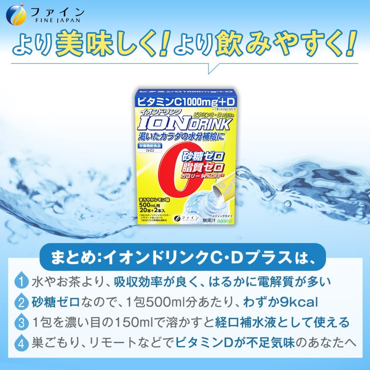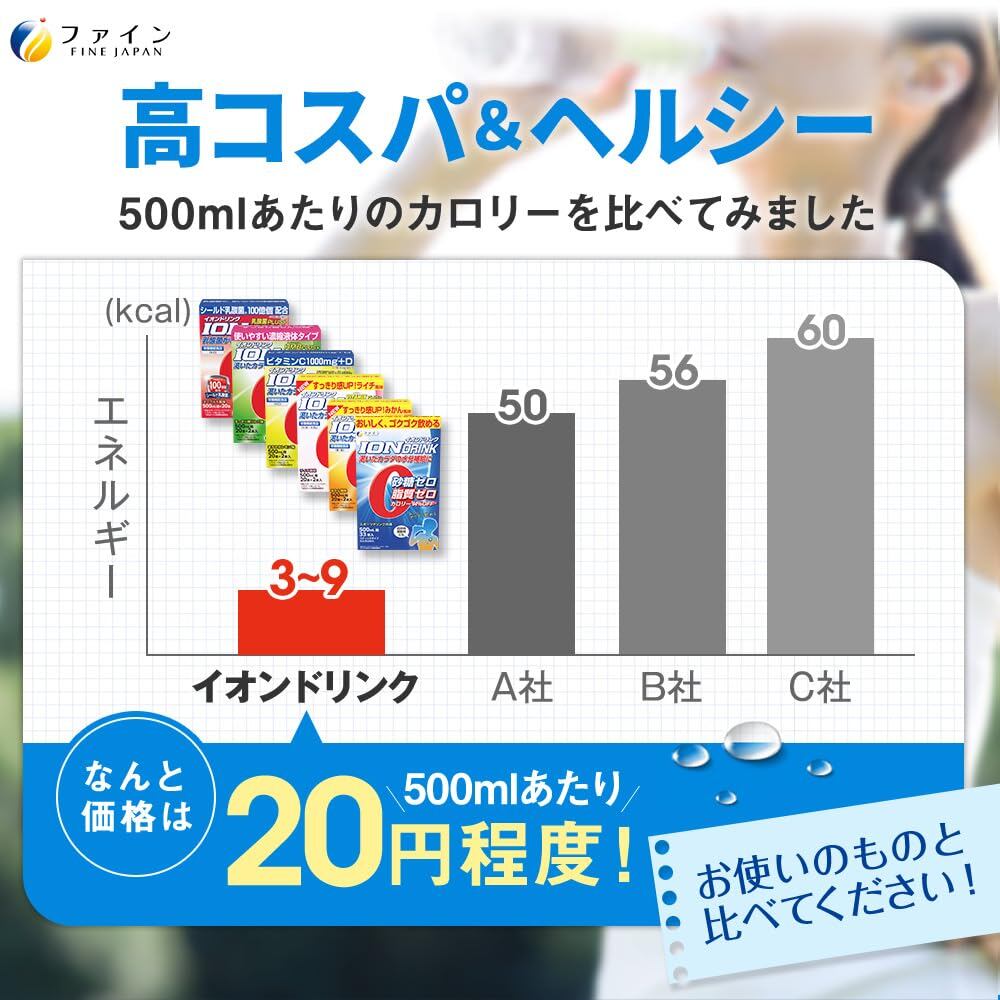 ファイン スポーツドリンク イオンドリンク ビタミンC・D 砂糖ゼロ 脂質ゼロ ビタミンC 1000mg ビタミンD ミネラル配合 国内生産 22包×3個セット。 おいしくゴクゴク飲めるまろやかレモン味です。 砂糖ゼロ、脂質ゼロ、カロリー94%off。 巣ごもり、テレワークなどで太陽にあたることが減り、不足しがちなビタミンDもしっかり配合。 浸透圧80 mosm/Lのハイポトニック飲料です。 スポーツ時・お風呂上り・起床後などに水分、電解質を速攻チャージ。 エネルギーを作るのに欠かせないクエン酸も330mg配合しています。 経済的! コスパが良いというお声を多くいただいております。 使いやすいスティック状の顆粒タイプで500mlのペットボトルにサッと溶かすだけのちょうどよい分量サイズです。 一箱でペットボトル22本分お使いいただけます。 シリーズ累計178万個のファインイオンドリンクシリーズに「ビタミンC1,000mgとビタミンD8.5μgをプラス」したイオンドリンクC・Dプラスがラインナップ。 ファインは、自社研究開発(研究所FBRC)、健康食品GMP対応自社生産工場(兵庫県3工場)など一貫した国内供給体制で、あらゆるジャンルのニーズを調査し、皆様にご満足いただける商品を提案し続けます。 規格成分(1包(3.2g)あたり)クエン酸 330mg 内容量:70.4g(3.2g×22包) 原産国:日本。 商品の性質上、固まりやすくなっておりますが、製品上問題はございません。 開封時にほのかに固まっておりましたら、ほぐしてからご使用ください。 S000-K9999