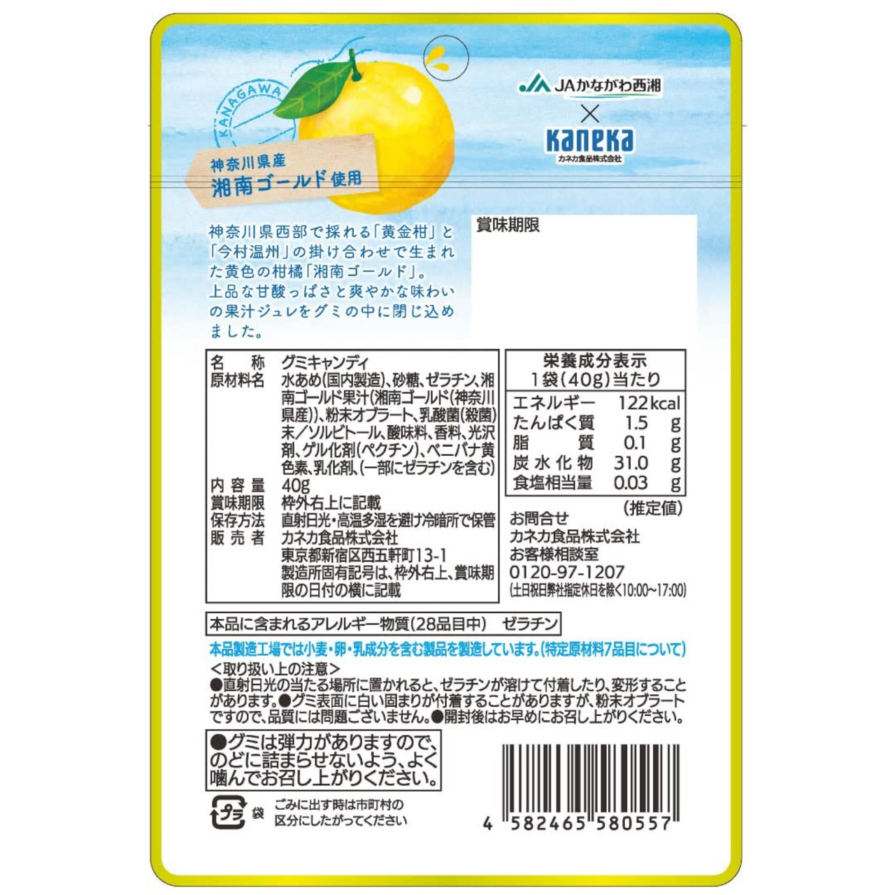【10袋セット】カネカ食品 湘南ゴールドグミ 果汁グミ ラブレ乳酸菌入り 40g×10袋 人気 大容量。 【商品特徴】神奈川県西部で採れる黄色の柑橘「湘南ゴールド」を使用。 上品な甘酸っぱさと爽やかな味わいの果汁ジュレをグミの中に閉じ込めました。 【名称】グミキャンディ。 【内容量】40g×10袋。 【アレルギー物質】(28品目中)ゼラチン。 【注意事項】グミは弾力がありますので、のどに詰まらせないよう、よく噛んでお召し上がりください。 S000-K9999