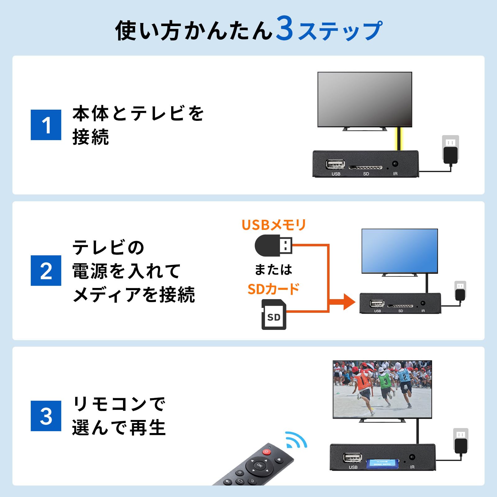 サンワサプライ メディアプレーヤー SDカード/USBメモリ対応 HDMI/RCA出力 Full HD リモコン付き MED-PL2K102。 動画、音楽、画像データをテレビやプロジェクターで再生できるメディアプレーヤーです。 再生したいデータをUSBメモリ、またはSDカードに保存して本製品に接続すれば、パソコンを使うことなく再生できます。 HDMI、RCAコンポジットの端子から出力できます。 ※同時出力はできません。 最大1920×1080pixelの出力が可能です。 画面の回転が可能で、縦向きのディスプレイでも使用可能です。 S000-K1010