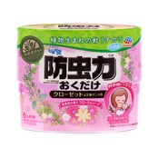 ピレパラアース 防虫力おくだけ フローラルソープの香り [置き型 1個入]。 商品紹介 衣類についたニオイをクリーニング消臭。 5つの天然消臭成分配合のプレミアム消臭ゲルが強力な消臭効果を発揮します。 殺虫成分は使用せず、しっかり防虫します。 植物成分によるフィティンチッドの効果で衣類を守ります。 殺虫剤を含んでいないので、薬剤に敏感な方でもお使いいただけます。 どこにも置きやすい容器形状です。 ゲルが減るのが目に見えて取替え時期が分かりやすい。 効果は6か月間持続します。 使用上の注意 定められた使用方法及び使用量をまもる。 用途以外に使用しないこと。 洋服ダンス、クローゼット等の密閉性のあるところで使用して下さい。 衣類の入替をする際は、部屋を換気すること。 使用開始後、約6か月もちますが、温湿度等により変わることがあります。 開封前に、内容器の中が結露している時がありますが、そのまま使用できます。 外容器側面のフックは確実に閉めること。 他の防虫剤と併用できます。 本品は食べられません。 食べた時は医師に相談すること。 内容器の中の薬剤にふれないこと。 手についたときは石鹸でよく洗うこと。 子供の手の届くところに置かないこと。 密封して直射日光、凍結を避け、涼しいところに保管すること。 原材料・成分 防虫成分、植物成分、(カルボン、α-ピネン・スペアミントオイル)その他(ゲル化剤、乳化剤、香料、水等)。 商品サイズ(幅×奥行×高さ):148mmx64mmx122mm。 内容量:300mL。 置くだけゲルタイプ。 植物成分によるフィトンチッドの効果で衣類を守る。 取り替え時期がわかるゲル状防虫剤。 S000-K9999