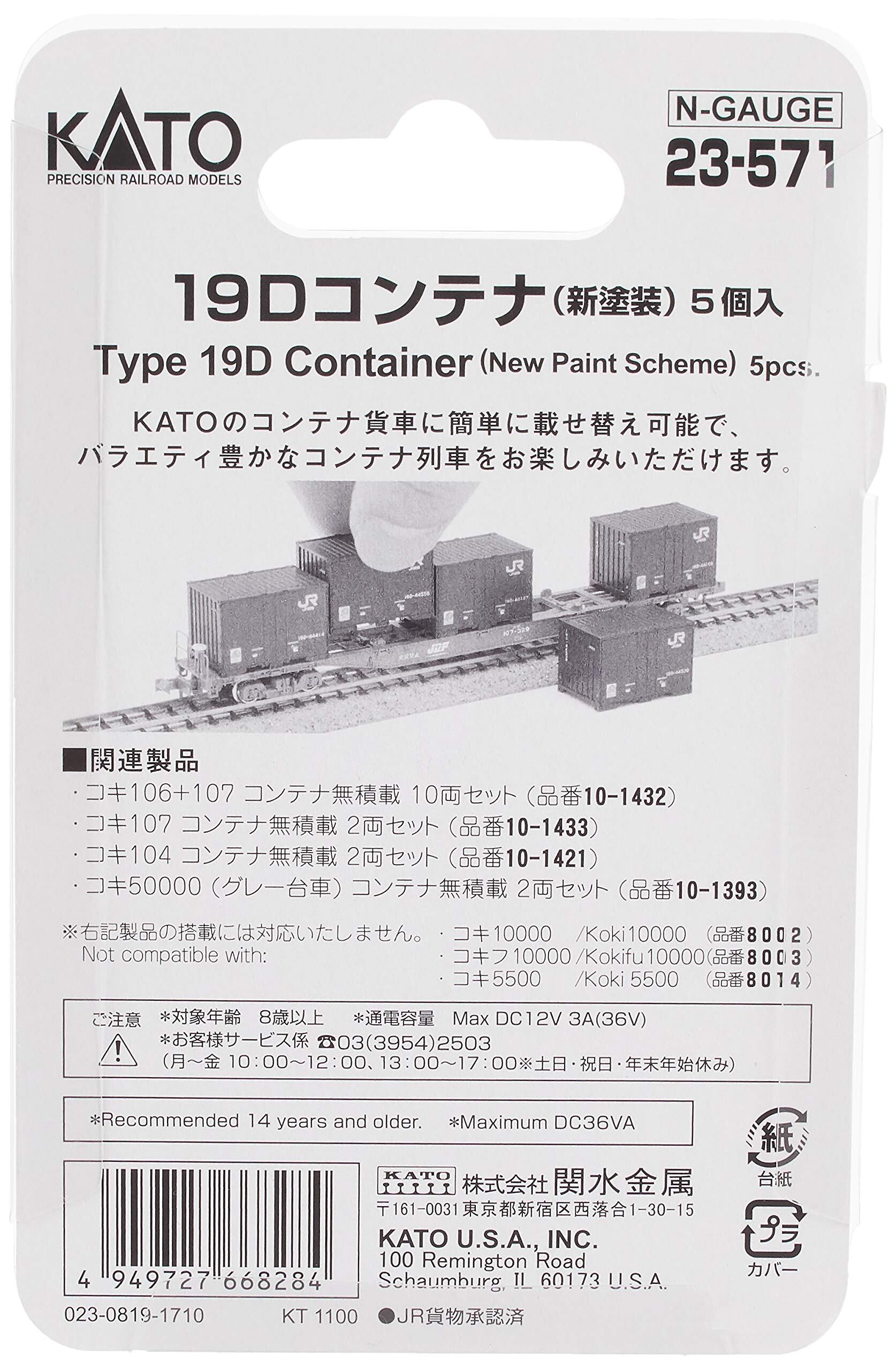 KATO Nゲージ 19Dコンテナ 新塗装 5個入 23-571 鉄道模型用品。 既存製品とは異なるシンプルな外観・表記を再現。 コンテナのサイズを見直し、貨車への積載時に隣りとのコンテナの隙間が狭くなり、よりリアルな状態を再現。 ツメの位置や構造などは既存製品を踏襲。 エコレールマーク付。 。 無積載のコキ各形式に自由な組み合わせで搭載し、実際の貨物列車同様のバラエティに富んだ編成でお楽しみいただけます。 完全新規製作のコンテナのみの5個セットになります。 JR貨物承認申請中 日本石油輸送株式会社 商標使用許諾申請中。 S000-K9999