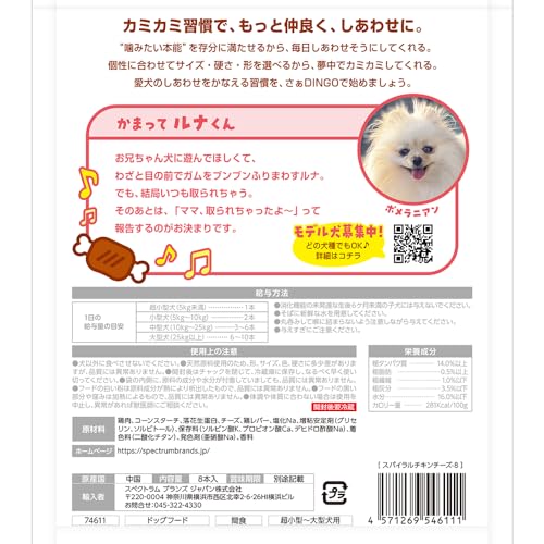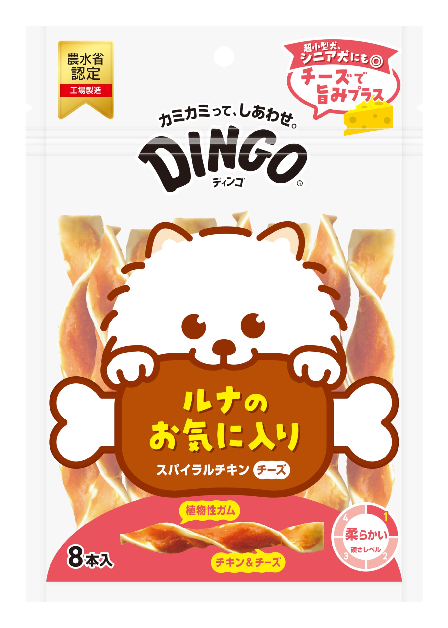 ディンゴ (Dingo) スパイラルチキンチーズ8本入 長持ちガム ストレス解消 イタズラ噛み防止 歯の汚れや歯垢を落とす おやつ 犬。 商品紹介 チキンの旨みがガムに染み込んで最後までおいしいおやつです。 原材料・成分 鶏肉、コーンスターチ、落花生蛋白、チーズ、鶏レバー、塩化Na、増粘安定剤(グリセリン、ソルビトール)、保存料(ソルビン酸K、プロピオン酸Ca、デヒドロ酢酸Na)、着色料(二酸化チタン)、発色剤(亜硝酸Na)、香料 使用方法 本品は生後6ヶ月以上の犬用です。 対象年齢以外の犬には与えないでください。 カミカミって、しあわせ!。 程よい弾力と柔らかさの植物ガム使用。 シニア犬や超小型犬にもおすすめです。 チーズ入りで旨みをプラスしています。 チキンの旨みがガムに染み込んで最後までおいしいおやつです。 S000-K9999