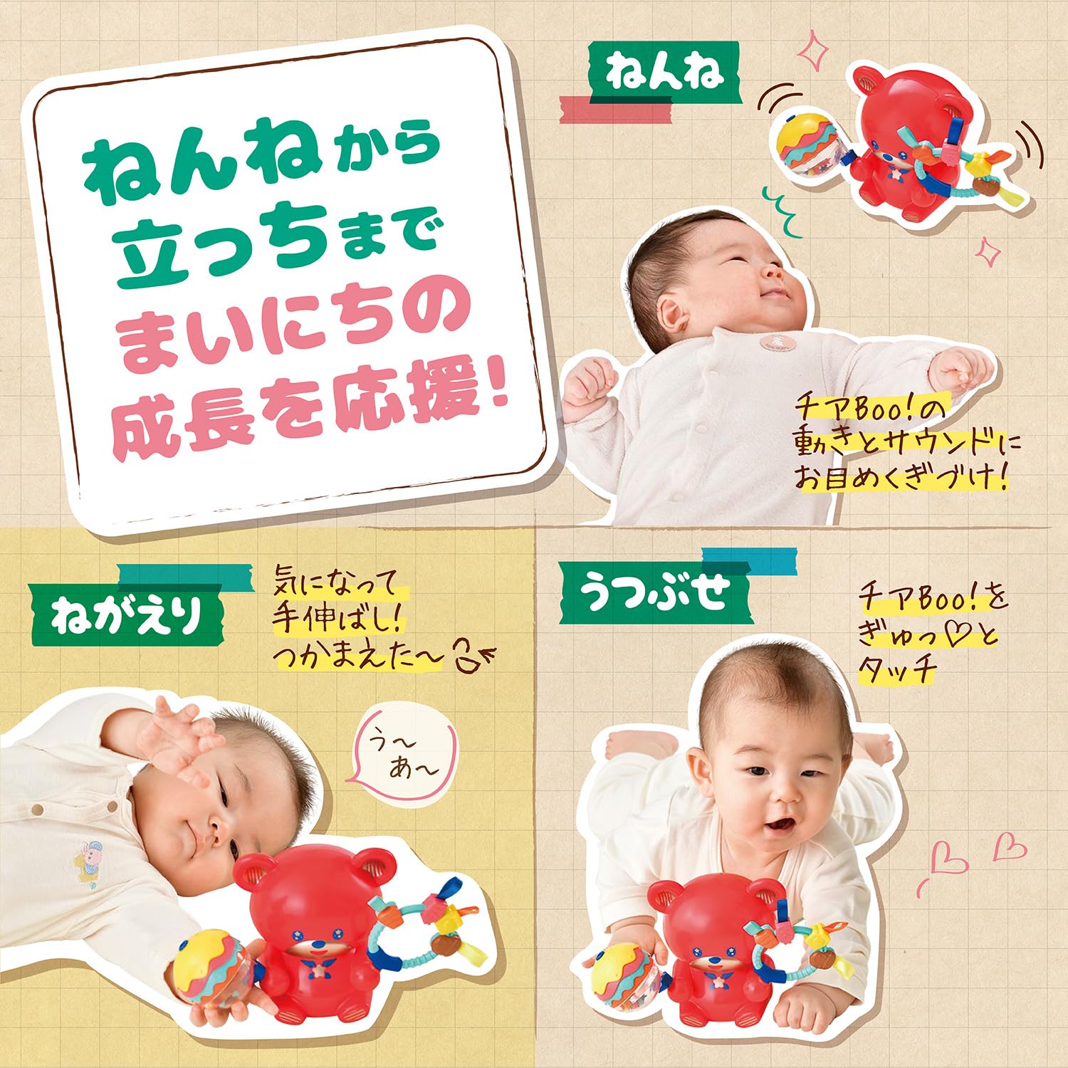 ピープル ねんねから立っちまでまいにちの成長を応援!チアBoo! 赤ちゃん夢中!な動き×サウンド×あそび TB-163。 【ねんねから立っちまで毎日の成長を応援】 赤ちゃんが認識しやすいカラーと「いないいないばあ」の動きでお目めくぎづけ 手伸ばししたくなるサイズ・形状でうつ伏せ、寝返り、ずりばい、つかまり立ちの練習にぴったり お手て「なめいじリング」と「くるしゃらボール」は取り外して、なめかみ・指先のおもちゃとして遊べます。 「メロディモード」ではゆったりテンポの童謡や子守歌を全4曲収録。 「おしゃべりモード」では赤ちゃんの喃語や笑い声を収録。 対象年齢:0ヶ月以上。 ねんねから立っちまで毎日の成長を応援。 商品サイズ:幅17cm×奥行10cm×高さ13cm。 単三電池3本(別売)。 S350-K9999