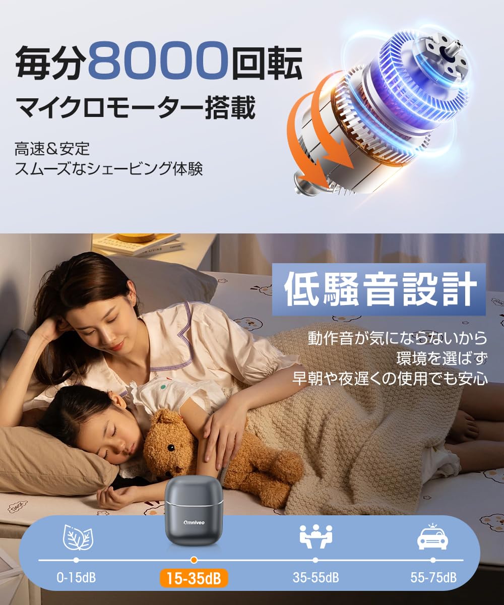 ひげそり 電動シェーバー 【2025新・超軽量小型・360°回転式深剃り】 髭剃り 電動 Type-C充電式 急速充電 低騒音 シェーバー メンズ IPX7防水 乾湿両用 自動研磨機能 電気シェーバー 電動髭剃り AI感応技術 自動スタート メンズシェーバー 男性 父の日 旅行 出張 車内常備 プレゼント ギフト。 【超軽量&ポケットサイズ】いつでもどこでも快適シェービング。 この ひげそり 電動シェーバー は、手のひらに収まる超 小型 設計で、重さわずか約83g。 ポケットやバッグにもすっきり収納できるので、通勤・旅行・出張・車内など、シーンを問わずサッと取り出して使用可能。 ひげそり 電動 をお探しの方や、携帯性を重視する男性におすすめの 電気シェーバー メンズ モデルです。 常に清潔感をキープしたい方に最適な シェーバー メンズ です。 【360°回転式ヘッド×AI感応でボタン不要】革新的 ひげそり 体験。 360度回転する浮動ヘッドが顔の輪郭にフィットし、アゴ下やフェイスラインもスムーズに剃れるから、忙しい朝でも素早くきれいに 髭剃り 完了。 さらに、AI感応技術を搭載し、肌に触れるだけで自動スタート。 わずらわしいボタン操作は不要な 電動シェーバー です。 電動シェーバー 人気ランキング にもランクインする実力派!毎日のシェービングをもっと快適に。 【日本製ステンレス刃&自動研磨システム】切れ味長持ちで肌にやさしい。 高品質な日本製サージカルステンレス刃を使用し、シャープな切れ味でスピーディーに剃り上げる ひげそり 電動シェーバー 。 加えて、自動研磨システムを搭載し、常に鋭い切れ味を保つので、長く快適に使える シェーバー メンズ 。 肌への負担も少なく、敏感肌の方でも安心。 ひげそり シェーバー にこだわる方にこそ使ってほしい、 髭剃りおすすめ のモデルです。 【IPX7完全防水&乾湿両用】 お風呂剃り もできる 電動髭剃り 。 IPX7等級の防水設計により、本体を丸ごと水洗い可能。 清潔に保ちやすく、お風呂場でも安心して使用できる 電動シェーバー 。 ドライ剃り派の方にも、フォームや泡を使ったウェット派の方にも対応する2WAY仕様。 これ1台で乾湿両用のシェービング体験を楽しめます。 ひげそりおすすめ として、 髭剃り カテゴリでも高評価を集める逸品。 【1.5時間で急速充電&45日連続使用】低騒音設計でいつでも快適。 大容量350mAhバッテリー搭載で、約1.5時間の急速充電で最大45日使用可能な 電気シェーバー メンズ 。 5分間のクイックチャージ機能で1回分のシェービングも対応可能。 さらに、動作音はわずか15〜35dBと超静音設計で、早朝や深夜でも周囲を気にせず使える 電動シェーバー 。 髭剃り 電動 をお探しの方や、 電気シェーバー人気ランキング で静音性重視の方にもぴったりです。 S000-K9999