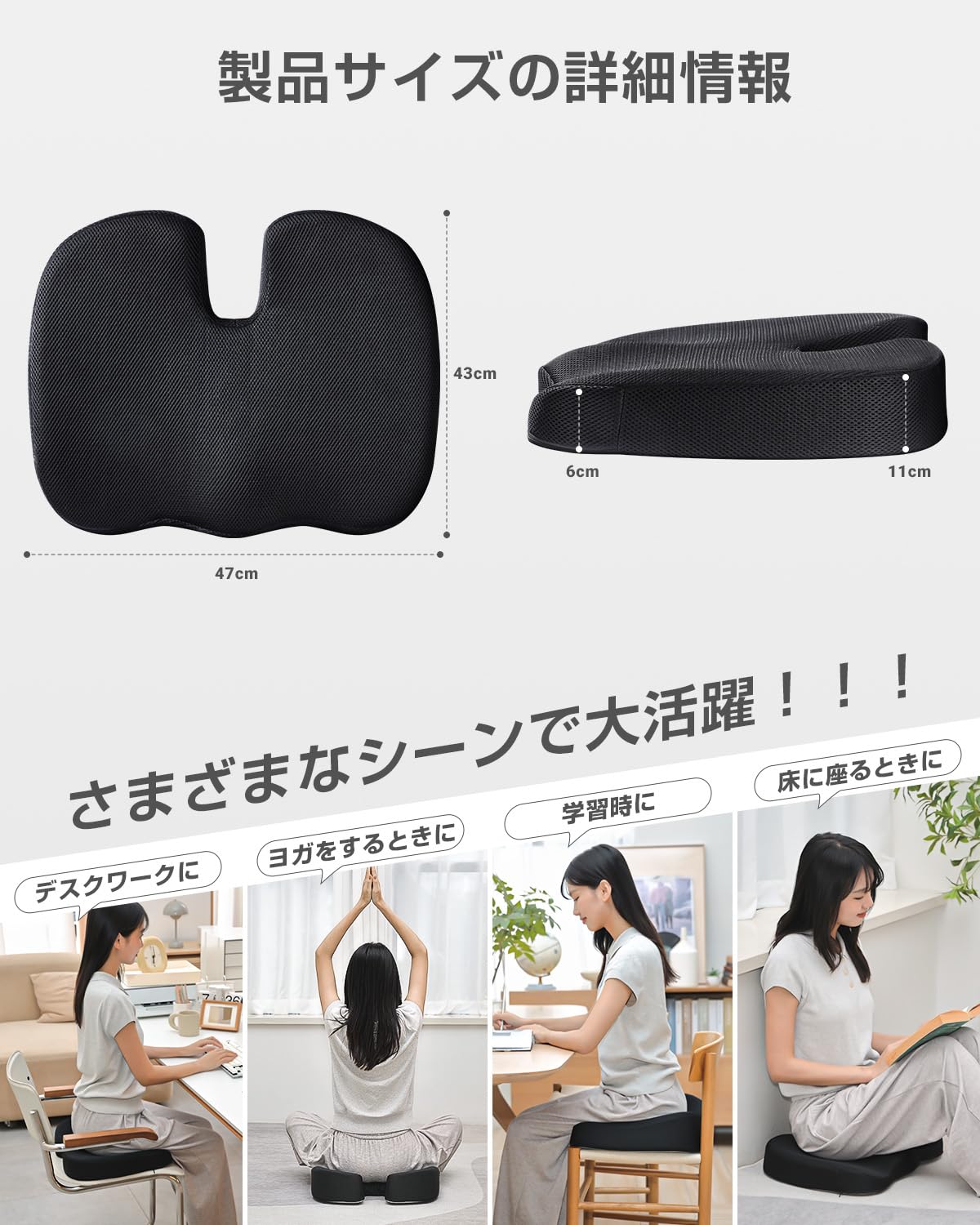 【医師推薦】椅子 クッション 座布団 お尻が痛くならない チェアパッド 腰痛 姿勢矯正 低反発クッション 高通気性 カバー洗える 滑り止め付き オフィスチェア 車椅子 自動車用 父の日/母の日/誕生日プレゼント/クリスマス 43*47*11-6CM。 【低反発・椅子クッション】米国の医学博士が長年の経験に基づいて設計しました。 尾てい骨を優しくケアし、柔らかな座り心地と安定性を両立。 人間工学に基づいた立体設計と低反発素材が腰や骨盤への負荷をやわらげ、座るだけで自然に前頃する姿勢を持ち、背筋が自然と伸びることで無理なくて正しい姿勢へ導きます。 【人間工学・3Dデザイン】人体工学的に設計された低反発クッションは、腰の自然なラインに密着し、尾骨をしっかりサポートします。 長時間の着座による腰への圧迫を軽減し、慢性的な腰痛やギックリ腰、坐骨神経痛の症状を緩和します。 柔軟な素材が体重を均一に分散させるため、座り心地を向上させながら、長時間勤務や運転時の腰の負担を最小限に抑えます。 【低反発ウレタン素材&体圧分散で疲労軽減】高品質の素材を採用し、長時間を座っても変形しない。 体圧が1点に集中することにより体の一部に力が集中し、腰痛や骨盤の歪みの原因になる可能性があります。 均一に体圧分散を行うことで体への負荷を軽減する効果が期待できます。 大きいサイズでオフィスチェアや車のシートにもピッタリ!。 【通気性抜群&洗濯機丸洗い可能】縦糸構造は空気の通り道が多く、通気性に優れているため、おしりが接している部分が蒸れにくくて快適です。 ファスナー付きで、カバーが簡単に取り外しできて洗えるので、ご家庭の洗濯機で丸洗いも可能です。 いつでも清潔に、気持ちよくお使いいただけます。 注意:付属するカバーは洗濯機で丸洗いできますが、本体は洗えません。 お手入れは、乾いた布等で拭くに留めましょう。 また、洗濯ネットに入れて洗濯を行ってください。 【様々な場所で大活躍】人間工学に基づいた立体設計と低反発素材が腰や骨盤への負荷をやわらげ、座るだけで美しい姿勢がつくれる3Dクッション。 身体が余裕で収まる幅広の座面サイズで、奥行きもあるので深く腰掛けられ安定感が高まります。 デスクワークや車の運転時、フロアクッションとしてなど、マルチに活躍するアイテムです。 お使いの椅子が硬くて腰やお尻が痛くなってしまう方、オフィスチェア用の敷きクッションを探している方、在宅勤務で使えるクッションが欲しい方など、あらゆるお客様のご要望にお応えすべく、シンプルかつ機能的なクッションを開発いたしました。 クッションカバーには、使い場所を選ばないシンプルなブラックを採用しており、自宅やオフィス問わず、幅広くお使いいただけるように設計いたしました。 【プレゼントとしておすすめ&サイズ】縦43x横47x厚さ6〜11cmオフィス、車のシート、車椅子、デスクなど様々な場所で利用可能。 母の日、父の日ギフト、プレゼント、誕生日プレゼント、クリスマス、敬老の日などプレゼントとしても最適です。 S000-K9999