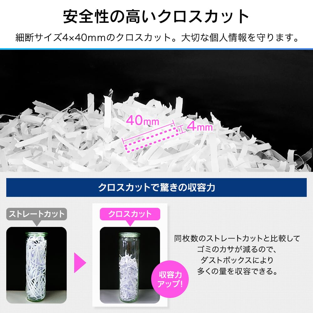 アイリスオーヤマ シュレッダー 家庭用 クロスカット 卓上 コンパクト 容量8.7L 細断枚数5枚 静音 小型シュレッダー P5GCX2 ブラック。 コンパクトなので、家庭や小規模オフィスにおすすめなシュレッダーです。 約4×40mmのクロスカット採用。 ステープラー針の裁断が可能(11号まで)なので、仕分け作業が不要です。 ダストボックス容量 “8.7L”のたっぷりめで、A4コピー用紙が約65枚分収容可能です。 S000-K9999
