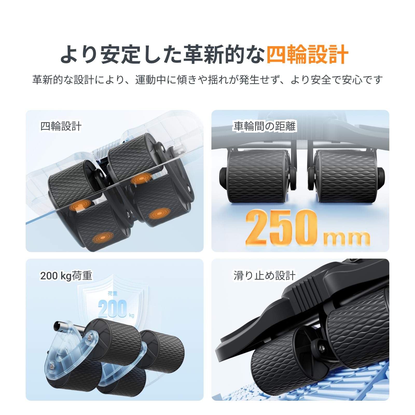 MERACH (メリック) 腹筋ローラー 4輪 LCDディスプレイ 自動スプリングバック スマートブレーキ type-c充電 スマホスタンド付き 膝マット付き 荷重200kg 組立簡単 静音 プロ 腹筋 ローラー 腹筋マシーン 腹筋マット アブローラー トレーニング エクササイズ ストレッチ ダイエット 筋トレ 器具 男性/女性 初心者/上級者 自宅 床傷つけない ブラック。 【より安定した四輪設計&静音&耐荷重200kg】革新的な四輪設計はローラーの滑り止め設計に合わせて、騒音を減少させた上で、運動中の横揺れや転倒などによる不安を解消し、トレーニングをより安全で安心にします。 耐荷重も200 kgにアップし、より多くの体重の方に合うようになりました。 【自動スプリングバック・スマートブレーキ】この腹筋ローラーには自動リバウンド機能が搭載されており、手動で引き戻す手間が省け、トレーニング効率が向上し、初心者にも使いやすくなります。 また、上級者が高強度のトレーニングをしたいというご要望に応じて、腹筋ローラーが前に転がる距離が大きいほど、蓄積された弾力が大きくなる設計を施しました。 これにより、より強い抵抗を感じることができ、腹筋トレーニングの効果も期待できます。 【回数・時間・消費カロリーが一目瞭然&Type-C対応】この腹筋ローラーには液晶ディスプレイが搭載されており、リアルタイムで回数、時間、消費カロリーを正確に表示することができます。 これにより、いつでも自分の運動データを把握し、運動データに基づいてトレーニングの回数や強度を調整し、運動効率を高めることができます。 また、Type-C充電にも対応しています。 【スマホスタンド・膝マット付き&肘マットデザイン】この腹筋ローラーはスマホスタンドを内蔵しており、市場にある多くのスマホと互換性があり、運動しながら動画を観ることができます。 肘を置く底部には厚みを増した柔らかいマットが設計されており、肘を保護しながら快適さを高めています。 膝を保護するために、膝マットも付属しています。 膝マットサイズ:365*275*15mm。 S000-K1010