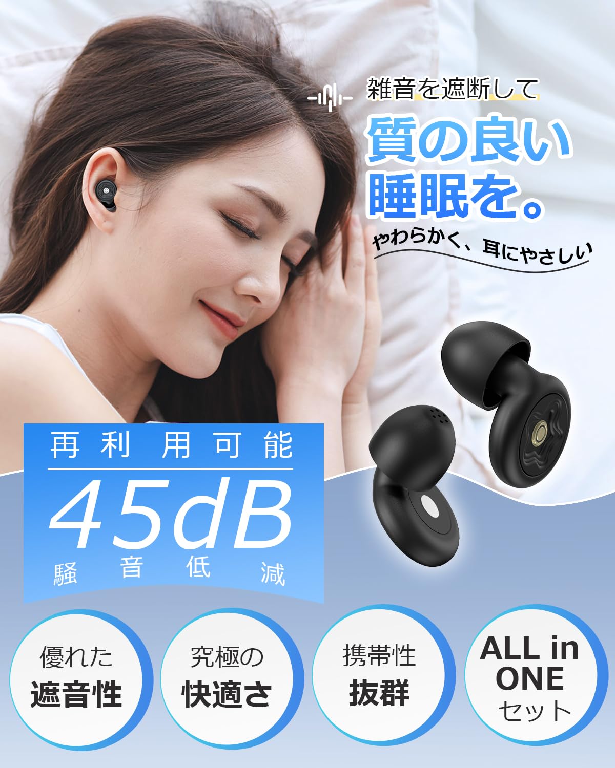 耳栓 睡眠用 いびき防止 45dB低減 みみせん 遮音 快眠 安眠 騒音対策 ノイズキャンセリング 水泳/仕事用/勉強/ライブ/旅行/機内用 安眠グッズ 聴覚プロテクション イヤチップ シリコン製 水洗い可能 繰り返し 収納ケース付 ブラック(XL/L/M/S)。 【いびき対策・45dB高遮音】この耳栓は、多層の防音構造と高密度な吸音素材を組み合わせ、精密に設計されたシーリング形状と流線型のデザインが耳に完璧にフィットし、最大45dBのノイズ低減を実現。 完全遮音の耳栓ではありませんが、いびきや生活音をしっかりカットしつつ、アラームや呼び出し音など必要な音は聞き取れるように配慮されています。 これにより、いびきだけ聞こえない耳栓として、日常シーンでも安心してご使用いただけます。 快適な睡眠と必要な情報の両方を手に入れましょう。 【横向き睡眠対応・痛みゼロ設計】無菌処理されたナノソフトシリコン素材を使用しているため、つけているのを忘れるほどの軽さで、横向きに寝ても長時間つけても痛くなりません。 睡眠用耳栓として人間工学に基づき設計された特殊な形状が耳道に完璧にフィットし、圧迫感や不快感を解消します。 聴覚過敏の方も安心して使えるノイズキャンセリング機能で、朝までぐっすり快適にお休みいただけます。 「朝までフィット、ストレスフリーな耳元へ。 理想の耳栓がここに。 」。 【防水防音設計・繰り返し水洗い可能】水泳中や入浴中でも安心して耳栓をご使用いただける完全防水設計。 繰り返し水洗いが可能なので、いつも清潔な状態を保ち、衛生的に長くお使いいただけます。 この耳栓はノイズキャンセリング性能を保ちながらも、目覚ましやアラーム音はしっかり聞き取れるよう配慮設計で、日常生活での使いやすさも抜群。 イヤーマフのような大掛かりな装備なしで、集中したい時の防音対策を⼿軽に実現します。 【交換可能ツインイヤーピース付属】耳栓には、単層と二層の2種類のイヤーピースに加え、4サイズ (S・M・L・XL)のイヤーチップが付属。 これにより、耳のサイズや用途に合わせて最適な耳栓を選ぶことができ、外耳道に差し込むだけで最高のフィット感と遮音効果を実現。 仕事中、勉強中、就寝時など、あらゆるシーンで最高の遮音効果を発揮します。 (ご注意:耳栓にはLサイズのイヤーキャップが装着されています。 )。 【携帯性抜群!専用ケース付き耳栓】付属の耳栓専用ケースで、オフィス、旅行、飛行機など、どこでも清潔な状態で持ち運べます。 ホコリや湿気から耳栓を守るだけでなく、紛失の心配も解消。 聴覚過敏の方も安心の機能性と、環境への配慮を両立したサステナブルな設計です。 大きな音が苦手な方や聴覚過敏・音嫌悪症でお悩みの方に最適な、まさに理想の耳栓です。 S000-K9999