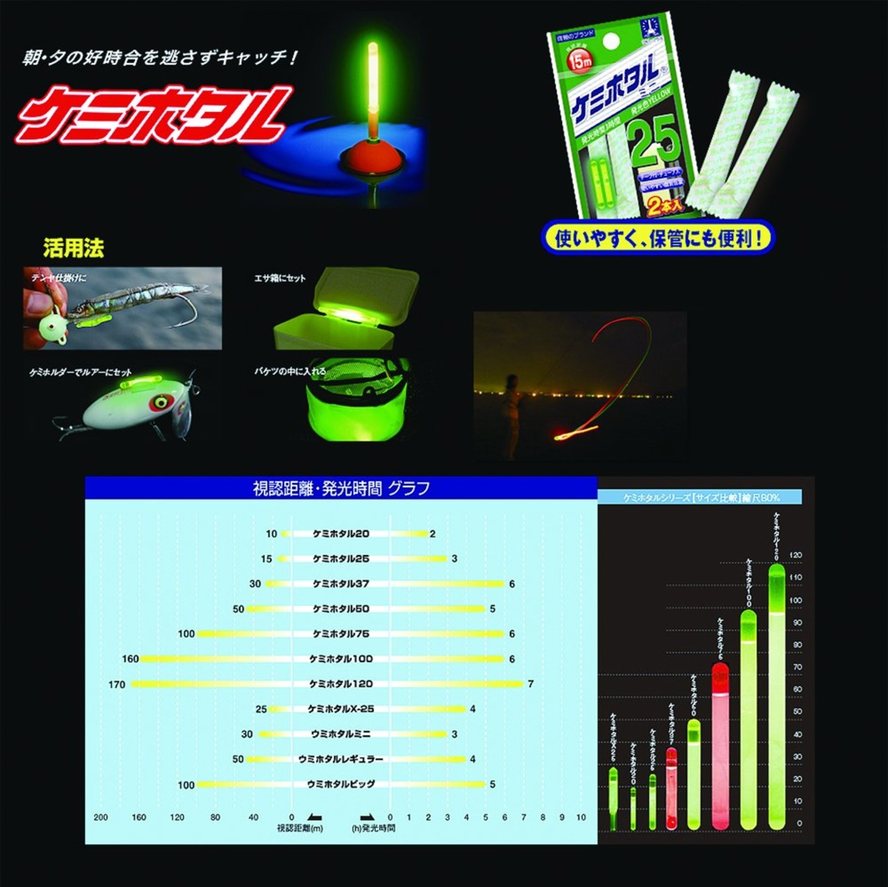 ルミカ(日本化学発光) ケミホタル25 イエロー (2本入リ)。 フカセ釣りに最適の小型タイプ。 近場での釣りに!。 仕様:2本入り。 付属品:テープ・チューブ付。 サイズ: 2.9×23mm。 重量:0.15g。 視認距離:15m。 発光時間:3時間。 S000-K9999