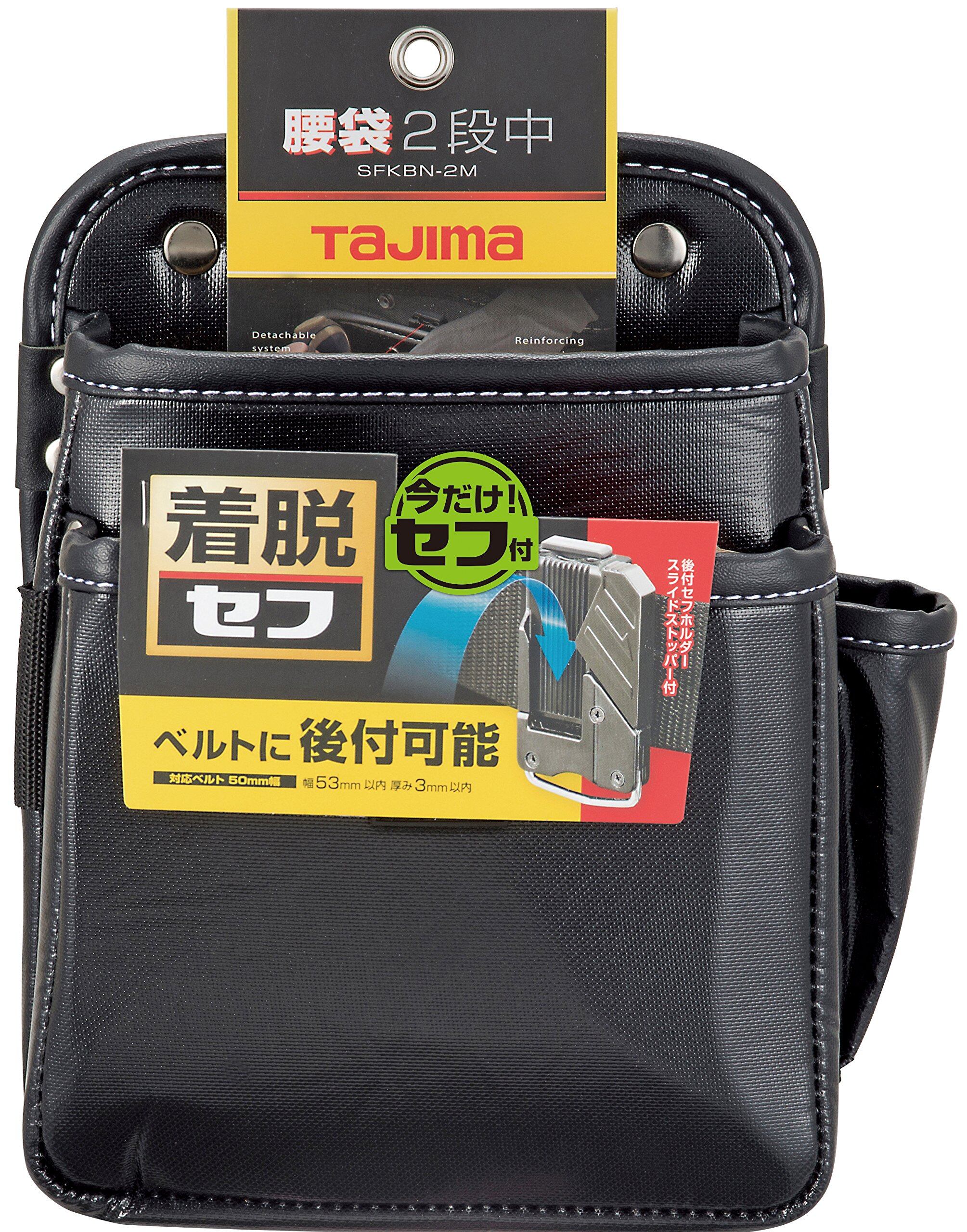 タジマ セフシステム 着脱式腰袋 2段中 水気に強い高密度ナイロン SFKBN-2M 着脱楽々 ベルトに後から装着可能 腰道具の組み換えが簡単 使う道具だけを選んで装着 腰の負担軽減 工具の落下防止。 腰周りの組み換えが簡単な着脱式 幅広い職人さんに適したスタンダード形状 ベルトからの浮きを防止するサイドクリップ装備 左側面は幅広ベルト付。 後付けホルダーでコンベ等のアレンジが可能。 ※アレンジされる場合でも総重量は3kg以下となります。 ベルトを外さず途中から差せる後付式ホルダー採用。 用途:建築作業現場用着脱式腰袋。 セフ取付収納物総重量:3kg。 対応ベルト幅:50mm。 防水加工:PVCフィルムでコーティングした高密度ナイロン生地でEVAフォーム材をサンドイッチした5層構造のタジマオリジナル生地採用。 換え用品:セフ後付ホルダー用スライドストッパーSF-CHLDST。 S000-K9999