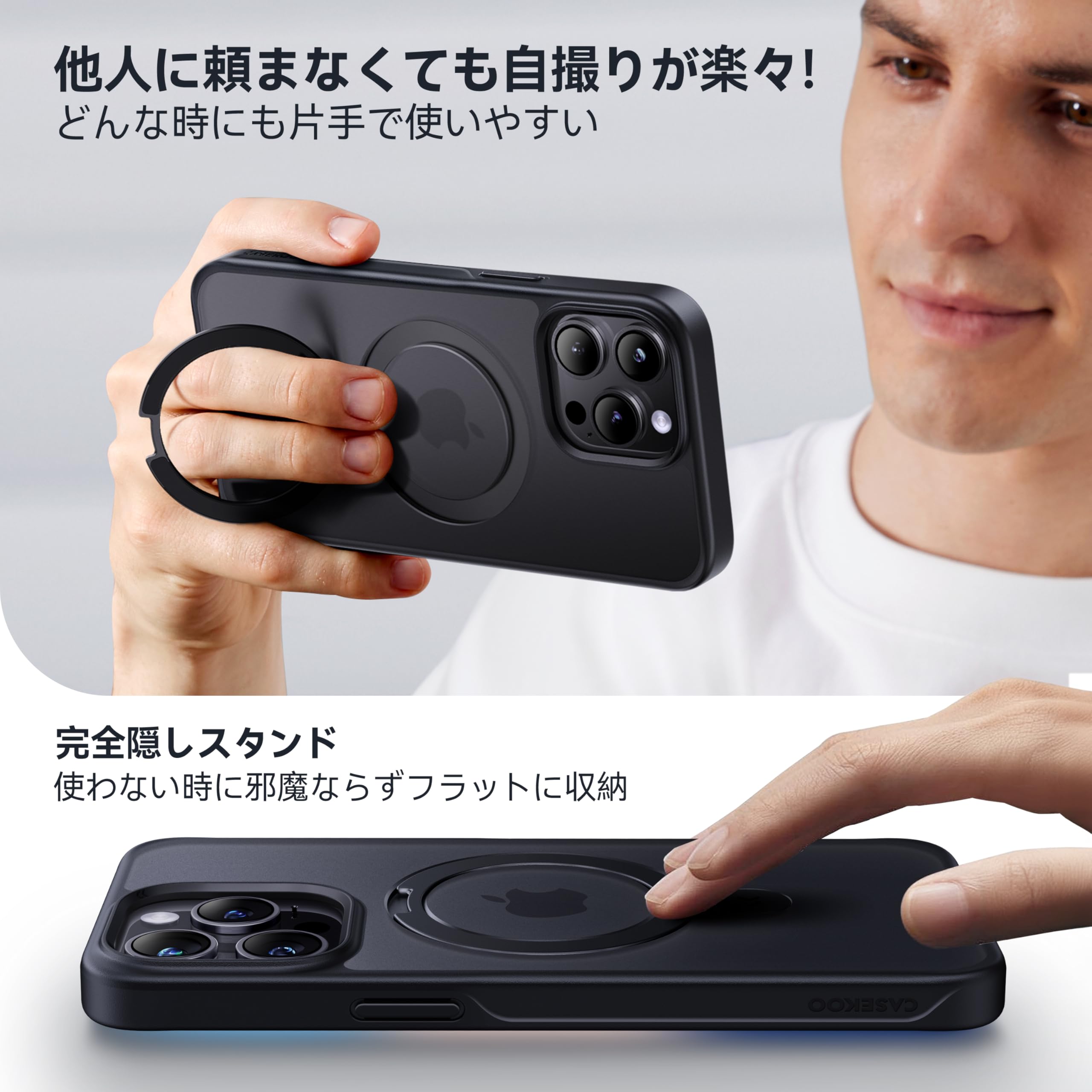 【8年間の技術結晶!4in1超万能モデル】CASEKOO iPhone 15 Pro 用 ケース 米軍MIL規格 耐衝撃 MagSafe対応隠しスタンド 指紋防止 マット仕上げ 黄変防止 薄型半透明 ストラップホール付き ワイヤレス充電対応 アイフォン15pro用ケース(ブラック)。 【MagSafe対応&両面式マグネット】市販で装着するとワイヤレス充電できないスマホケースとは異なり、弊社独自のHalbach配列磁界閉鎖技術により、端末への影響がなくスマホのワイヤレス充電機能に干渉がなく、最大15W高速ワイヤレス充電ができ、業界最強なN55磁石で吸着力は従来より20倍も高くなり、MagSafe対応の車載ホルダーに装着した状態で、悪路の走行中でも落下の心配もなく快適です!また両面式マグネットを採用しており、冷蔵庫、壁、キチンなど金属あるところに、貼り付けたのまま動画視聴も可能です。 両面磁力なので、黒板、冷蔵庫、ジムのマシン、車載ホルダーなどさまざまな場所で使えます。 対応機種:いPhone15proケース。 【指紋や油汚れ防止&いつでもキレイでサラサラ!】高精度のマット艶消し表面処理と防汚バイオニック技術を使用することで、指紋や油汚れなどの問題を徹底的に解決!夏場でも、ベタつきの心配は不要で、いつでもサラサラでキレイな状態でをご使用頂けます。 半透明なマット仕上げなので、スマホの美しいデザインとロゴも隠しません。 またストラップホール付きで、紛失や落下も防ぐことができます。 対応機種:アイフォン15pro用ケース。 【米軍規格取得・驚異の防御!】業界高レベルの硬度と耐衝撃度を実現。 落下させてもスマホ本体は綺麗に無傷!過酷な米国国防総省の耐衝撃試験「MIL-STD-810G」認証クリアし、特別な振動低減技術と三重耐衝撃構造、ケースの四隅に独自のU-AIRクッションを搭載することにより、衝撃吸収性能を20倍アップ!どのような角度の衝撃に対しても受け止めて大切なスマホをしっかりと保護!また、側面にだけの滑り止め設計により、ホールド感が高まり、春から夏にかけて手汗が濡らしても滑りにくい。 米軍MIL規格認証番号:GZMR220702237705|認証機関:CSTC Standards Testing Center。 【カメラレンズ保護&細部までこだわり】 iphone15 proケースの縁の部分は画面とカメラレンズより1.5mm以上高く、下置きしても画面が直に接触しないので、画面やカメラが擦れることを防ぎます。 本体の細部までしっかり保護しているので、とっても安心!側面は独自の滑り止め設計によりマット素材の滑りやすさを解消!各ボタンはフィット感を重視し、ピッタリ密着して違和感がない。 ケースは容易に着脱可で、押しやすさを追求したボタンは上下に隙間を設ける独自の設計、ボタンの反応がよく、程よい押し心地を実現。 またストラップホール付きで、紛失や落下も防ぐことができます。 S000-K9999