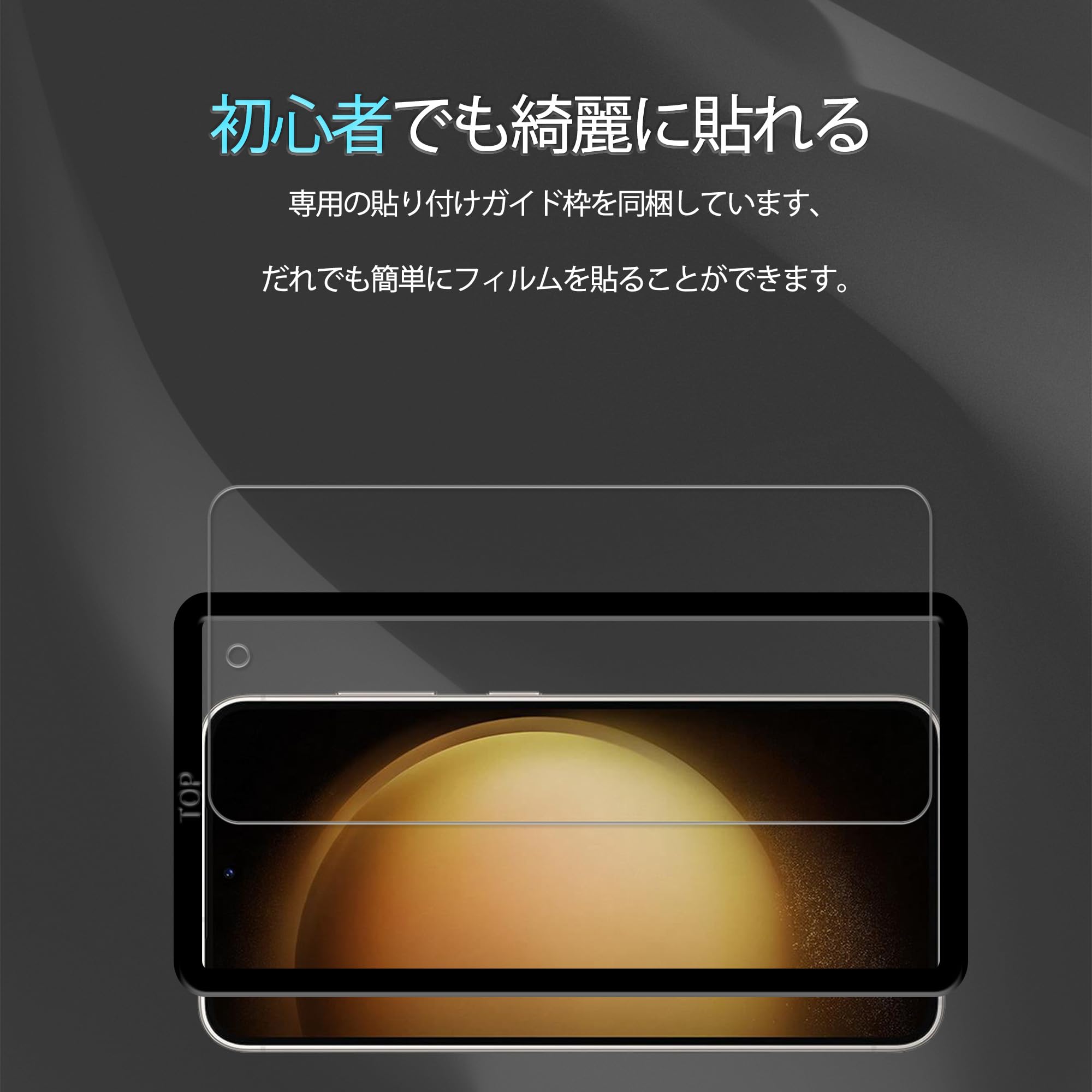 【2+2枚セット】ガイド枠付き KPNS 日本素材製 強化ガラス Galaxy S23 FE SCG24 用 ガラスフィルム カメラフィルム カバー 保護フィルム。 【よくある問題】 1. 貼り付けた後、ホコリが入っる場合はどうすればいいでしょうか? 強化ガラスを割れないように一気に剥がした後に、セロハンテープや同梱のラベルシートでホコリを取り除き再度丁寧に位置を合わせながら貼って下さい。 2. 気泡が1円玉サイズで残った場合はどうすればいいでしょうか? 画面を擦っても圧着出来ない場合が多いので、 この場合は、じわじわと剥がして、 再度貼り付けるとキレイになります。 位置のズレやほこりなどが入っておらず、気泡が抜け切らない場合は貼りなおさずに1週間ほど放置していただきますと自然になくなります。 【対応機種】Galaxy S23 FE scg24 ガラスフィルム2枚 + カメラフィルム2枚。 【注意】この電話の画面の端は湾曲しているため、保護フィルムのサイズが丁度良い場合、しっかりと貼り付けられず、白いエッジやシェルとの干渉などの問題があるため、保護フィルムは画面よりも小さいです。 【9H硬度・日本製ガラス素材】日本旭硝子製ガラス素材採用 最上級強度のガラスを使用し表面硬度は9H。 万が一スマホを落としてガラスが割れても、 ガラス破片が飛び散らないような安心設計。 飛散防止 、ガラス破片から守ります。 【申し分ない透明感】:画質を徹底して追求するため、最高級のガラスを選択し、透過率を実現しました。 透き通ったガラスフィルムに多層フィルタフィルムを採用し、素晴らしい透明度を確保して、一体感になって、まるで貼っていないみないような感覚で携帯の美しさはそのままにお楽しみいただけます。 【指紋防止、高感度タッチ】ガラスフィルムには撥油コーティングが施されており、指紋や汚れなどに強くなめらかな操作感を実現、付着した汚れなどは簡単に拭きとれます。 こちらは高耐久撥油コーティングが施され、つるつるな滑り感を実現!ゲームしても渋くなし!。 【気泡防止・貼付け簡単】気泡防止加工が施されているので、気泡が入りにくい。 万が一気泡が入ってしまっても時間が経てば徐々に抜けるので 美しい仕上がりに。 ガラスを液晶に置くだけで自然に吸着、簡単に気泡が抜いて行くので、誰でも簡単、綺麗に貼ることができます。 フィルム貼りことが苦手の方でも簡単に貼る事が可能です。 S000-K9999