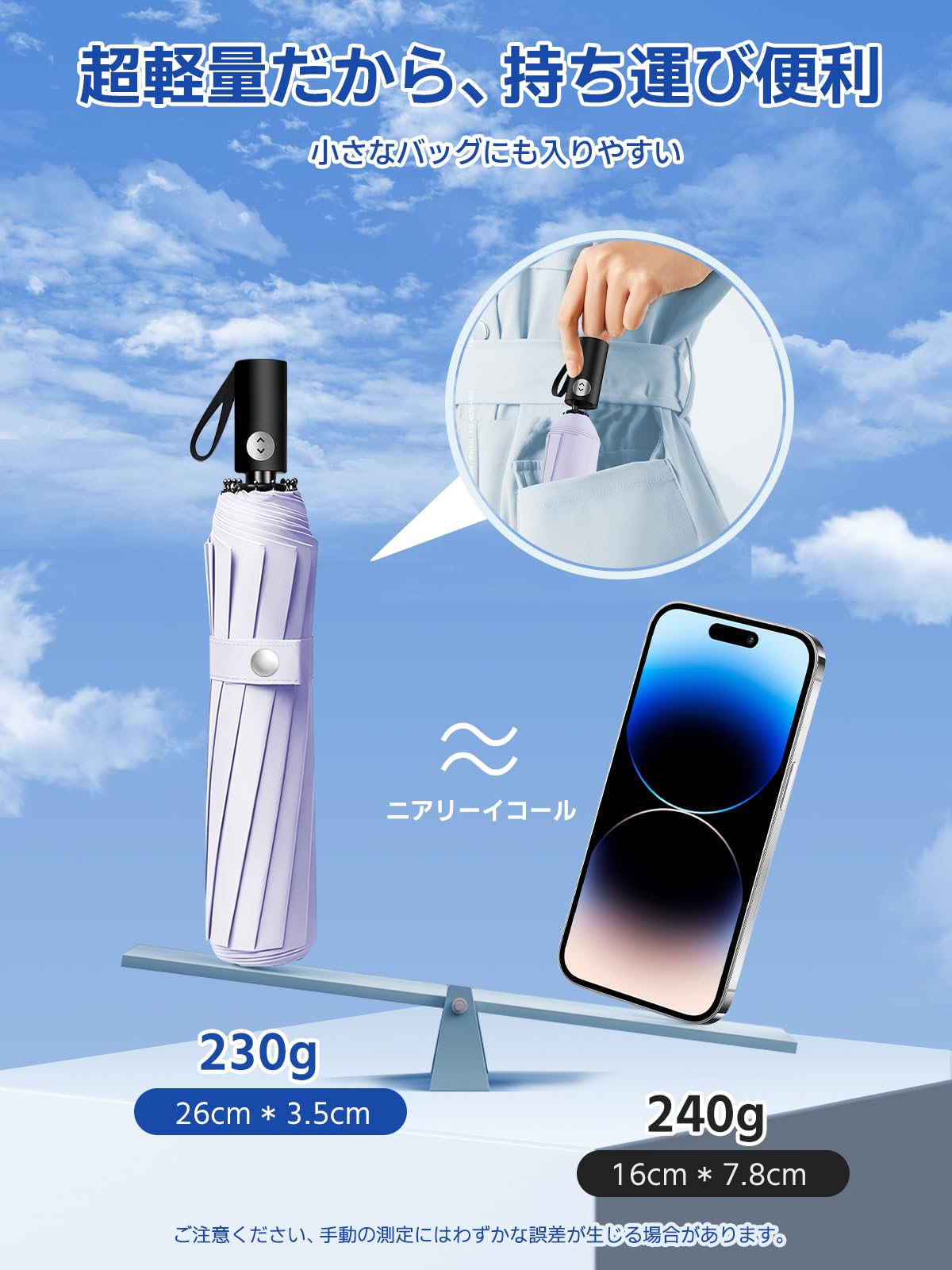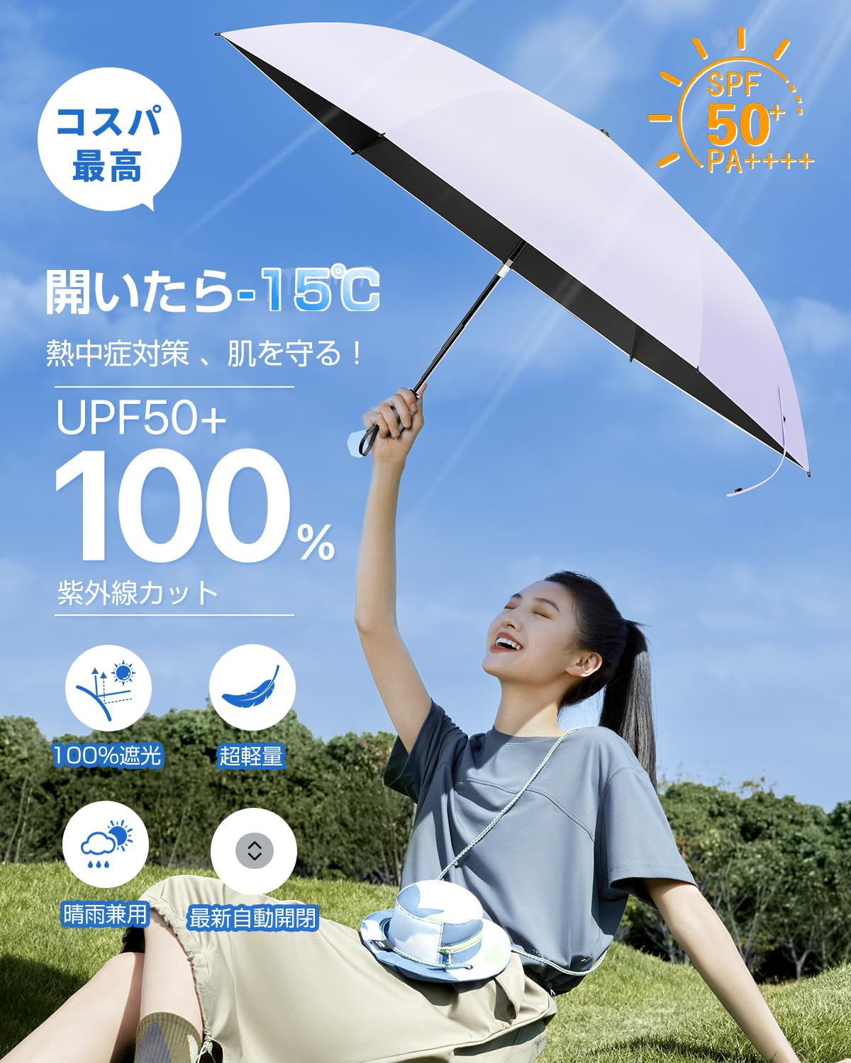 【現役皮膚科医監修 JIS認証&段階収納】日傘 UVカット100遮光遮熱 折り畳み傘【業界初!安全式自動開閉】ALwgreen折りたたみ傘 大きい超軽量 熱中症対策 肌を守る おりたたみ傘 晴雨兼用 耐風頑丈 携帯便利 超撥水日傘兼用雨傘 レディース/メンズ/子供/大人兼用 収納ポーチ付き 母の日 父の日 お祝い 誕生日プレゼント2年メーカー保証 (薄紫)。 【JIS認証!100%遮光遮熱・UPF50++】新生チーム『日傘』が再び業界を席巻!ALwgreenのおりたたみ日傘は、一般の基準を100倍上回るJISの専門認証を獲得しています。 この業界最高基準の日傘は、ドイツ輸入のRadi-Cool反射冷却素材を使用し、複数の保護層で100%の遮光・遮熱効果を実現。 開いたら-15℃、傘の下は温度を下げる、『涼しいを持ち運ぶ』大人気の折畳み日傘です。 99.99%の紫外線を遮断し、厳しい暑さや日焼けから肌を効果的に守ります!。 【一歩先行く!業界初安全式自動開閉】傘を閉じるのが難しい、またはちょっとした不注意で反発してしまうことがありますか?…新世代のALwgreenワンタッチ自動開閉折りたたみ傘がこれらの問題を全て解決しました。 ALwgreen独自の安全式段階収納自動傘は、反発を防ぎながら段階的に収納し、省力60%!小学1年生のお子様でも簡単に扱えます。 10万回の開閉テストをクリアし、耐久性を大幅に向上させ、最長10年間ご使用いただけます。 【365日持ち歩く!コンパクト・超軽量】ALwgreenの折りたたみ傘は、軽量で強230グラム、折りたたみ後の厚みは4cm、他の折りたたみ傘に比べて格段に軽量で、コンパクトサイズ、毎日持ち運びにもうれしい!通学、通勤、遠足、旅行、出張、スポーツなどの場合がご利用できます。 【大きい、より実用!晴雨兼用・男女兼用】ALwgreenは、軽量性を保ちつつ使用性を追求しました。 最高レベルの防水テストを受けたAlwgreenの晴雨兼用傘は、雨だけでなく紫外線も防ぎます。 超大サイズ(直径97cm)、傘面は110cmに拡大され、一般の晴雨兼用折りたたみ傘よりも15CM大きく、より広い範囲を保護します、2人分の快適なスペースがあり、雨の日でも濡れることなく過ごせます。 310Tの高密度防水層は、雨水を瞬時に阻止し、乾かしやすく収納しやすいです。 S000-K9999