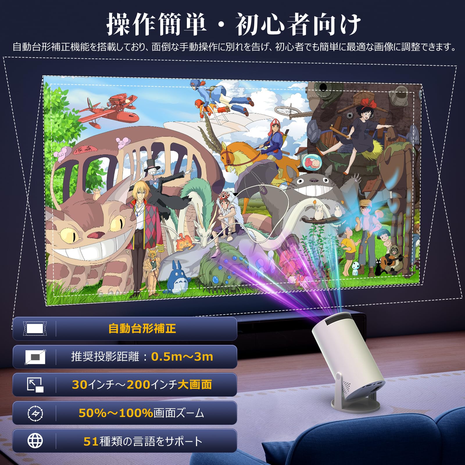 PliPla プロジェクター 家庭用【270°回転・18000LM・4K対応・Android TV搭載 最新登場! PSE認証済み】 プロジェクター 小型 高輝度 リアル1080P 天井投影 Wi-Fi6瞬間接続 Bluetooth5.4 HiFiスピーカー内蔵 自動台形補正 短距離投影 大画面 スタンド一体型 軽量 スマホ/パソコン/PS機など接続可 プレゼント 日本語取扱説明書。 【テレビよりコスパ最高】テレビがほしいけど、うちは狭い、テレビ置く場所ない。 テレビだと高いぞ~。 たまに家で映画館の雰囲気にしたいなぁ。 大画面でゲームしたい。 などなどの希望ございますか。 では、お客様の要求にご満足いただけるお得かつ多機能な家庭用のプロジェクターをおすすめします。 コンセントとWiFi、白い壁があればかなり小さな部屋でも視聴できます。 機能・アプリが充実している小型プロジェクターは壁にも天井にも簡単にきれいな画面を映せます。 更に日本語、英語、中国語、スペイン語など51種類の言語をサポートしており、どこの国のお客様でも簡単に操作できます。 また、リモコンで遠隔操作できて、大変便利で、日本語説明書もあり、初心者でもお気軽にご利用いただけます。 ※リモコンを操作する時、本体に向けて操作が必要です。 【きれいな映像をご提供】この家庭用プロジェクターは、高精度微小レンズで、明るさが18,000 ルーメンに向上し、1920*1080ネイティブ高解像度でリアル1080PフルHD対応可能で、NTSC 色域効果の 99% 以上を復元し、最大限によりリアルな画像やビデオを映し出します。 4Kに対応な高画質技術を搭載し、最大 12,000:1 の高コントラスト比、スクリーンなしでも、白い壁に投影するだけで自宅で3D映画を実現、臨場感あふれるホームシアター体験が楽しめます。 さらに、目に優しい拡散光イメージングとアンチブルーライト技術により、直射光よりも柔らかい光源で、子供やお年寄りでもご安心に好きなアニメやテレビ番組などを楽しみください。 ※鮮明な画像を確保するために、本体のフォーカスリングを回転させて投影距離と画面サイズを調整してください。 【270°回転・天井/壁掛け投影&自動台形補正】プロジェクターは三脚が不要、270°回転できる一体型スタンドを装備しており、スタンドを回転させるだけで、自由に投影角度を選ぶことができます。 壁や天井に投影でき、座っていても、寝転んでも、横になっても、楽な視聴体験を楽しめます。 さらに、この天井プロジェクターには自動台形補正機能も搭載されているため、面倒な手動操作とは別れを告げ、プロジェクター本体を振るだけで簡単に画像の形状を改善できます。 さらに、自動台形補正機能をオフにして、投影ニーズに応じて四隅の手動補正機能を介して画像の形状を手動で調整し、どの角度からでも完璧な画像を投影することもできます。 ※長時間連続して使用すると、製品が熱くなる場合があります。 3~4時間使用した後、20分以上休ませてから再度ご使用ください。 【Android TV&近距離投影&大画面】このホームプロジェクターはAndroid TVを内蔵しています。 Wi-Fiに接続後、Prime Video、YouTube、TVer、Netflixなど8000以上のアプリから50万本以上の映画やテレビ番組をお楽しみいただけます。 必要に応じてGoogle PlayやApp Storeから各種アプリをダウンロードし、家族や友達と一緒にお気に入りの映画やテレビ番組を視聴できます。 また、0.5M~3Mの近距離投影が可能で、狭い部屋にも十分で、30インチ~200インチの大画面を手軽に楽しめます。 ※アプリケーションのバージョンがアップデートする場合もあり、元のアプリケーションをアンインストールし、App Store または Google Play から再度ダウンロードすればご利用できます。 【超高速Wi-Fi 6&&高音質HiFiスピーカーBluetooth 5.4】このミニプロジェクターは自社開発の高精度チップ技術を採用し、2.4G + 5G帯域を同時に使用できるほか、超高速6G WiFi接続技術、安定した信号、高速伝送速度を備えています。 iOS、Android、Windowsデバイス(ミラーリングをサポートするスマートフォン、タブレット、パソコンなど)をWi-Fi経由ですばやく接続し、超スムーズでラグフリーのオンラインゲーム、映画鑑賞、ビデオ体験を簡単に楽しめます。 さらに、Bluetooth 5.4と高音質HiFiスピーカーも内蔵しており、お気に入りのスピーカー、DVDプレーヤー、ワイヤレスヘッドホンからの音声を再生でき、臨場感あふれる立体的なサウンドで圧倒的な没入感を提供し、自分だけの空間を作り出します。 ※長時間実行すると、デバイスのキャッシュエラーが発生し、Wi-Fi 接続が異常になる可能性があります。 このような場合は、キャッシュをクリアしてプロジェクターを再起動してください。 【幅広い互換性&80000Hの超長い寿命】Wi-FiとBluetooth接続に加えて、ミニプロジェクターはHDMI1.4、USB、3.5mmオーディオポートも装備しており、PC、DVDプレーヤー、タブレット、USBストレージ、PSゲーム機、スピーカー、ヘッドフォンなどと互換性があります。 また、独自開発の循環冷却システムにより80,000