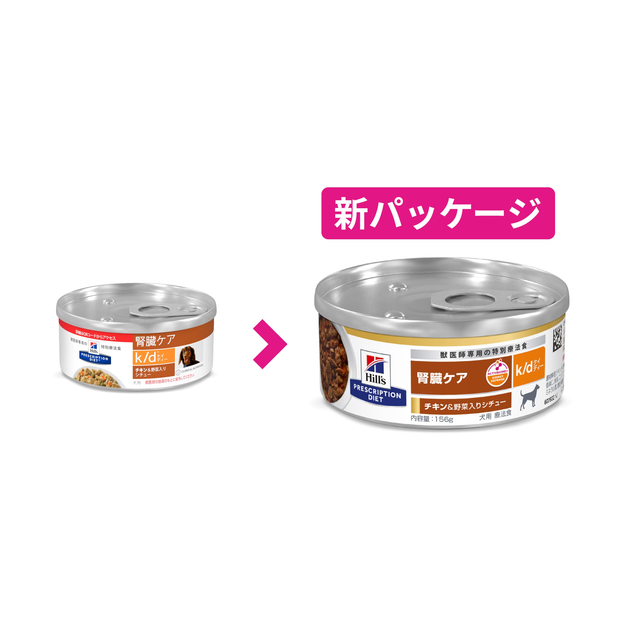 ヒルズ プリスクリプションダイエット ドッグフード ウェット k/d ケイディー 缶詰 チキン&野菜入り 腎臓ケア 犬用 特別療法食 156gx24缶。 商品紹介 愛犬の腎臓組織が損傷すると、血液中の老廃物を濾過し栄養分を再吸収する健康な腎臓機能を回復させることは難しいと言われています。 腎臓は一度低下した機能を戻すことはできませんが、進行を遅らせることは可能です。 腎臓管理のための特別療法食は、腎臓への負荷軽減をサポートし、より効率的に機能するのに役立ちます。 腎機能が低下した愛犬は食欲が減少する場合があり、食事の摂取量も低下する可能性があります。 ヒルズの栄養学者と獣医師が開発したプリスクリプション・ダイエット 〈犬用〉k/d ケイディーは、ベタインとヒルズ独自のプレバイオティクス繊維ブレンドであるアクティブバイオーム⁺キドニーディフェンスを採用することにより、マイクロバイオーム(腸内細菌叢)を活性化し、腎臓の健康をサポートします。 また、複数の食感や味が揃っており、好き嫌いのある犬にも最適です。 この愛犬が夢中になるシチューは、一口大のおいしい肉の塊と肉汁が入っており、チキンや野菜などの愛犬が好む健康的な食材で作られております。 事実、〈犬用〉k/d ケイディーは、リンやナトリウムなどを調整し、腎臓病の愛犬の生活の質(QOL)の向上に貢献することが科学的に証明されています。 製品サイズ:156g 原材料・成分 チキン、米、動物性油脂、ポーク、ライススターチ、グルコース、スクロース、卵白、ビートパルプ、亜麻仁、魚油、ニンジン、チキンエキス、セルロース、エンドウマメ、酵母、オート麦、フラクトオリゴ糖、卵黄、ミネラル類、増粘多糖類、アミノ酸類、ビタミン類、ベタイン、L-カルニチン 使用方法 この食事量は開始時の目安です。 ペットが適正な体重を維持できるように、必要に応じて量を調節してください。 詳しくは獣医師にお問い合わせください。 健康的な腎臓機能をサポート。 腎臓の機能に関わる腸内細菌叢の変化を管理するのに役立つ。 愛犬本来の筋肉を維持する力をサポート。 複数の食感と味をご用意。 S+OXSHIELD: ミネラルのバランスを調整し、ストルバイト(S)とシュウ酸カルシウム尿石(OX)の形成に配慮。 S000-K9999