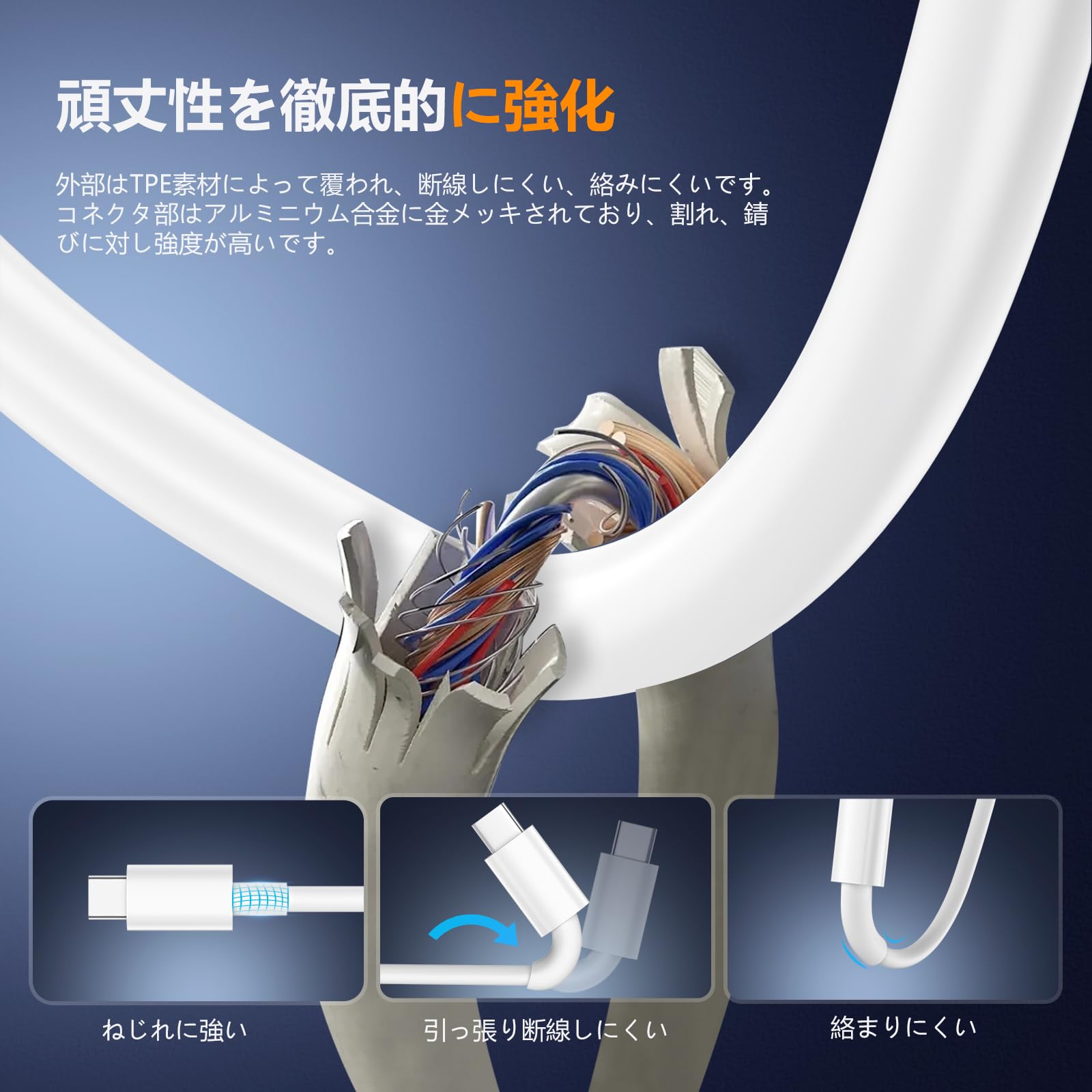 【2025正規MFi認証品】USB C ケーブル 100W/5A PD対応 1M/1M/2M 3本セット タイプc ケーブル 超急速充電 高速データ転送 断線防止 超高耐久 iPhone 16/15/Galaxy/iPad/MacBook/Android 各種その他機器対応。 【USB PD 100W 急速充電対応】:USB PD(Power-Delivery)対応により、最大100Wの高出力に対応しています。 スマホだけでなく充電に時間のかかる各種タブレット、PCなどの充電時間を大幅に短縮できます。 また、採用された高品質な銅線は電気抵抗が低く、充電時間を短縮してくれる一方で、コネクタは耐熱アルミニウム合金端子を採用しており、導電率が良くデータ損失も最小限に抑えます。 【最大480Mbpsデータ転送】:USB 2.0基準で最大伝送速度480Mbpsのデータ転送を対応します。 USB-Cに対応したスマホ、タブレット、ノートPC、ゲーム機及びその他のUSB-Cデジタル端末に充電とデーター伝送を対応します。 端子部には金メッキ加工を施しており、確実に信号を伝送するための設計もありますので、耐久性を確保しつつ安定の転送ができるUSB C to USB C ケーブルです。 【優れた耐久性】:Type-C ケーブル20000回以上の折り曲げ試験をクリアし、内部の無酸素銅、アルミ箔なども劣化しづらく耐磨耗性に優れています、外部はTPE素材によって覆われ、断線しにくい、絡みにくい、取り回しやすいです。 コネクタ部はアルミニウム合金に金メッキされており、割れ、錆びに対し、強度が極限まで高められたケーブルです。 【安全重視のこだわり設計】:伝導率の良い銅芯を採用した安全重視設計により、5Aの高出力を流せしかも過充電と発熱などを防ぎ、過電圧、過流、過熱、過電流、ショートや過負荷保護などの多重保護で、安定性の高い急速充電と大切な機器の損傷防止を実現します。 コネクタ部分にスマートチップが内蔵されているため、接続された端末を自動的に検知し、デバイスに最も良い電流出力で充電します。 【幅広い交換性】:Type-Cポート搭載の充電器、パソコンだけでなく、iPad Pro/Air iPad mini6 スイッチ Switch MacBook HUAWEI Galaxy Sony PixelなどType-c機種に繋いで充電やデータ転送、同期が可能です。 Type-Cケーブルはご自宅や職場などに置いたり、旅行や出張などの持ち運び用の予備とするなどの場用に大活躍!。 S000-K9999