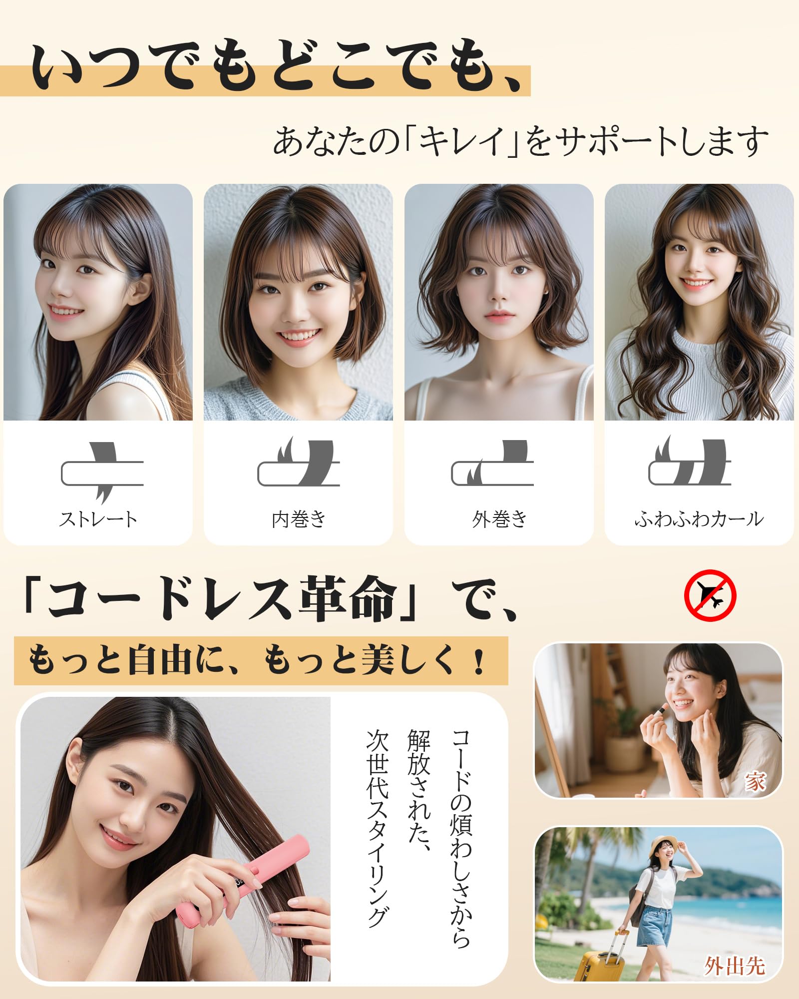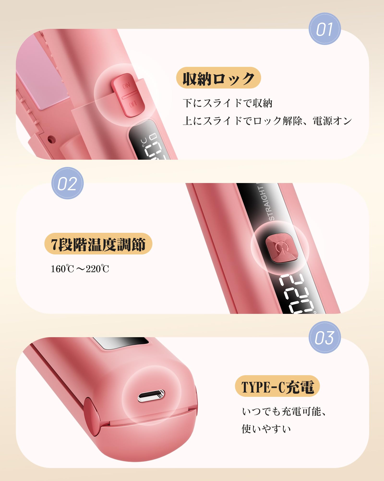 Goldmax ヘアアイロン コードレス 2WAY カール/ストレートヘアアイロン 無線 19mm定番プレート プロ仕様 TYPE-C充電 160℃~220℃ 7段階温度調整 自動電源OFF 誤起動防止ロック ミニ 小型 持ち運び便利 男女兼用 家庭/旅行/出張/通勤用 贈り物 (PINK)。 【コードレス設計でどこでもスタイリング可能】 本製品はコードレス設計で、充電式のヘアアイロンとしてどこでも簡単に使用できます。 5000mAhの大容量バッテリーを搭載し、充電時間はわずか3時間。 フル充電で最大40分間の連続使用が可能です。 外出先や旅行先でも、手軽にヘアスタイルを整えられます。 【7段階温度調節と90秒急速加熱】 160度から220度までの7段階温度調節が可能で、髪質やスタイルに合わせて最適な温度を選択できます。 90秒で最大220度まで急速加熱し、時間を節約しながら効率的にスタイリングが可能です。 液晶ディスプレイで現在の温度を一目で確認できます。 【負イオン機能で髪を保護しながらスタイリング】 負イオン機能を搭載し、髪のダメージを軽減しながらストレートやカールのスタイリングが可能です。 2wayデザインで、ストレートアイロンとしても巻き髪用アイロンとしても使用でき、多様なヘアスタイルを簡単に実現できます。 【コンパクトで持ち運びに便利】 小型で軽量なデザインで、バッグやポーチに収納可能。 電源ロック機能付きで、持ち運び中に誤作動を防ぎます。 USB充電対応で、パソコンやモバイルバッテリーからも充電可能。 忙しい朝や外出先での使用に最適です。 【男性も女性も使える人気のアイテム】 メンズにもおすすめのシンプルで使いやすいデザイン。 自宅でプロのようなスタイリングを実現できる人気のコードレスヘアアイロンです。 旅行、出張、デート前の準備など、さまざまなシーンで活躍します。 【ご注意】充電中に「1. 充電できない/途中で電源が切れる」といった現象を防ぐため、必ず5V2Aの充電アダプターをご使用ください。 S000-K1010
