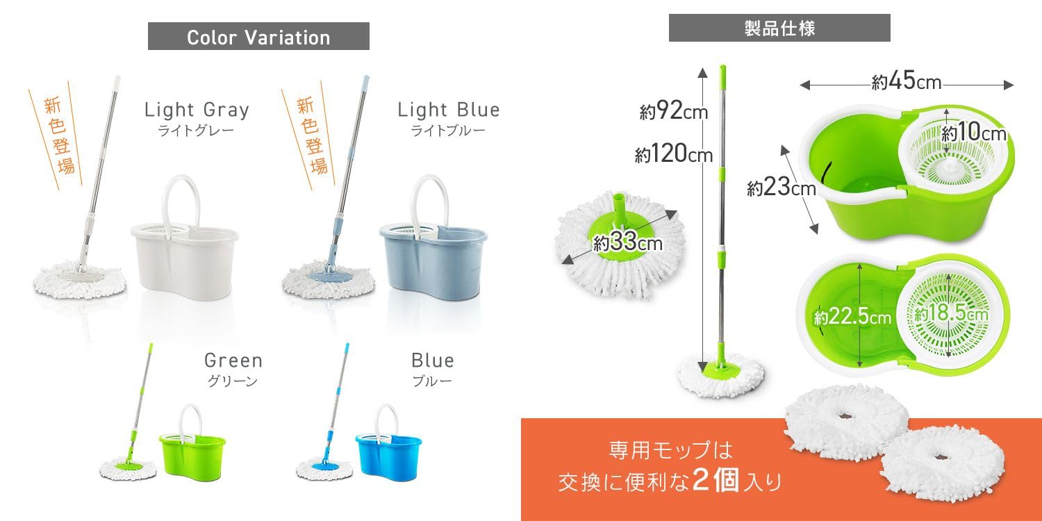 WEIMALL 回転モップ フロアモップ バケツ付き スペアモップ付き 洗浄 脱水 水拭き 乾拭き フローリング (ライトブルー)。 もう手は汚さない!ダブル回転で洗浄×脱水! 超カンタンもうペダルを踏む必要がありません。 モップを上下させるだけで回転します。 モップ部分はマイクロファイバー!! 小さなゴミやホコリなどの汚れがよく取れ、吸水・脱水性も抜群!! ベッドの下の隙間やエアコンの上の部分など、お掃除しにくい所や外窓、天井など、いろいろな場所・シーンに大変便利なお掃除グッズです! 【商品仕様】 サイズ(バケツ):(約)幅45cm×奥行26cm×高さ23cm サイズ(モップ):長さ92~120cm 重量(バケツ):(約):780g 重量(モップ):(約)550g 材質:PP、スチール、マイクロファイバー 他 【注意事項】 ・モップは十分に広げてお使いください。 ・モップ交換時はモップ部分を足で踏んで柄が可動する方向から90°方向に軽く倒してください。 ・高いところから落とさないでください。 ・海外製品で簡易梱包での輸入のため風防に擦れや多少の小キズなどがある場合がございますが、商品自体には問題ありませんのでご了承下さい。 ・商品はモニターによって色合いが異なって見える場合があります。 ・仕様/デザインは改良のため予告なく変更することがあります。 【商品仕様】材質:PP、スチール、マイクロファイバー 他。 【商品仕様】サイズ(バケツ):(約)幅45cm×奥行26cm×高さ23cm/サイズ(モップ):長さ92~120cm。 【商品仕様】重量(バケツ):(約):780g/重量(モップ):(約)550g。 【注意事項】・モップは十分に広げてお使いください。 ・モップ交換時はモップ部分を足で踏んで柄が可動する方向から90°方向に軽く倒してください。 ・高いところから落とさないでください。 ・海外製品で簡易梱包での輸入のため風防に擦れや多少の小キズなどがある場合がございますが、商品自体には問題ありませんのでご了承下さい。 ・商品はモニターによって色合いが異なって見える場合があります。 ・仕様/デザインは改良のため予告なく変更することがあります。 もう手は汚さない!ダブル回転で洗浄×脱水!超カンタンもうペダルを踏む必要がありません。 モップを上下させるだけで回転します。 モップ部分はマイクロファイバー!!小さなゴミやホコリなどの汚れがよく取れ吸水・脱水性も抜群!!ベッドの下の隙間やエアコンの上の部分など、お掃除しにくい所や外窓、天井など、いろいろな場所・シーンに大変便利なお掃除グッズです!。 S000-K9999