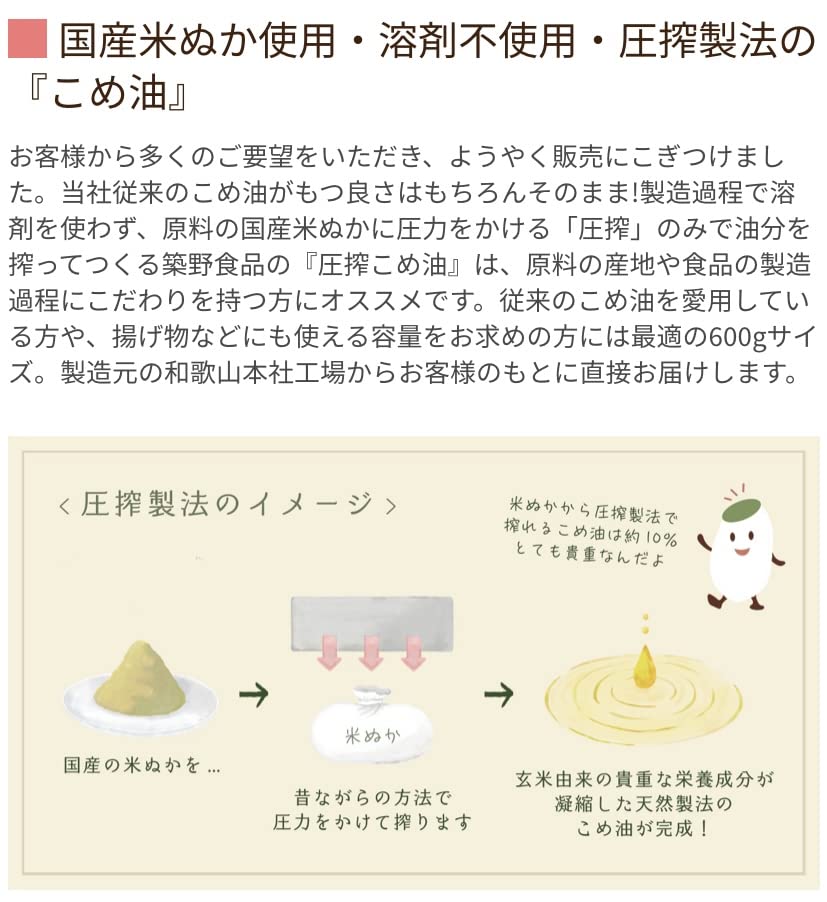 TSUNO こめ油 米油 圧搾 一番搾り 600g 溶剤不使用。 国産米ぬか使用。 溶剤不使用・圧搾製法のこめ油。 内容量:600g。 栄養機能食品(ビタミンE):ビタミンEは、抗酸化作用により、体内の脂質を酸化から守り、細胞の健康維持を助ける栄養素です。 S350-K9999