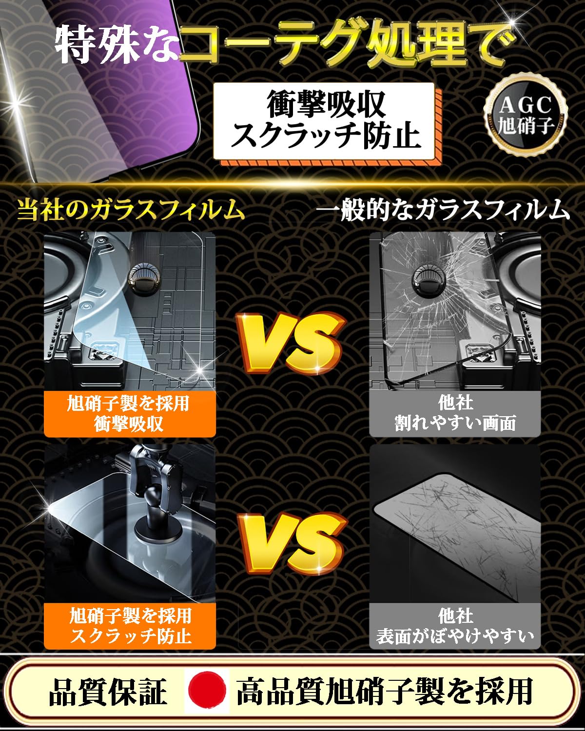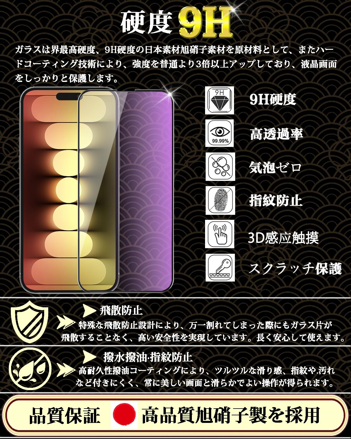 対応 iPhone15 Pro ブルーライトカット ガラスフィルム For iPhone 15Pro ガラスフィルム 目の疲れ軽減 全面保護フィルム【ガイド枠付き・1枚】日本旭硝子製 指紋防止 飛散防止 硬度9H 貼り付け簡単 自動吸着 気泡防止 撥水撥油 アイフォン15 Pro 用 液晶強化ガラス 6.1インチ。 【ブルーライトカット機能・目の疲れを軽減】ブルーライトへの対策として販売されているのがブルーライトカットガラスフィルムです。 ガラスフィルム は先進ブルーライトカット反射技術によりブルーライトを大幅にカットでき、目に掛かる負担を軽減し、色素沈着を防止、効果的に近視を予防でき、ディスプレイを長時間眺める方に効果を発揮します。 (正面から見るとブルーライトの部分が吸収され、三原色の赤と緑との割が増えて、淡い黄色に見える。 )。 【旭硝子素材採用!対応機種】iPhone 15 Pro ブルーライトカット ガラスフィルムは日本製の旭硝子を素材として採用し、業界最高レベルの9H硬度を持ち、耐衝撃性と耐傷性に優れています。 衝撃吸収の特性により、転落とかの外力からスマホ画面への衝撃ダメージを最小限に抑えることができます。 【気泡ゼロ・貼付け簡単】気泡防止加工が施されているので、気泡が入りにくい。 万が一気泡が入ってしまっても時間が経てば徐々に抜けるので 美しい仕上がりに。 自動吸着機能あり、ガラスを液晶画面スクリーンに軽く押すだけで自然に画面に吸着できます。 初心者やフィルム貼りが苦手の方にも安心です。 【指紋防止・撥水撥油】疎水性と疎油性のクリア レイヤーでコーティングされたガラスは、 指紋による汗や油分の残留を防ぎ、携帯電話の液晶画面をきれいに保持します。 フィルムに汚れ、水滴、ほこりがある場合は、簡単に拭き取ることができます。 S000-K9999