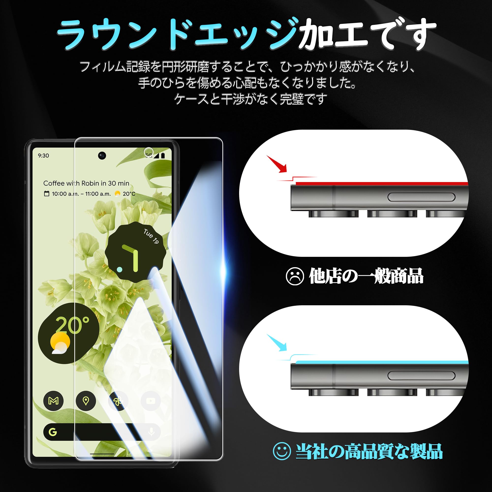 【2枚セット指紋認証】ガイド枠付き KPNS 日本素材製 強化ガラス Google Pixel 6 用 ガラスフィルム 強化ガラス カバー 保護フィルム。 【よくある問題】 1. 貼り付けた後、ホコリが入っる場合はどうすればいいでしょうか? 強化ガラスを割れないように一気に剥がした後に、セロハンテープや同梱のラベルシートでホコリを取り除き再度丁寧に位置を合わせながら貼って下さい。 2. 気泡が1円玉サイズで残った場合はどうすればいいでしょうか? 画面を擦っても圧着出来ない場合が多いので、 この場合は、じわじわと剥がして、 再度貼り付けるとキレイになります。 位置のズレやほこりなどが入っておらず、気泡が抜け切らない場合は貼りなおさずに1週間ほど放置していただきますと自然になくなります。 【対応機種】Google Pixel 6 ガラスフィルム2枚 。 【注意】この電話の画面の端は湾曲しているため、保護フィルムのサイズが丁度良い場合、しっかりと貼り付けられず、白いエッジやシェルとの干渉などの問題があるため、保護フィルムは画面よりも小さいです。 【9H硬度・日本製ガラス素材】日本旭硝子製ガラス素材採用 最上級強度のガラスを使用し表面硬度は9H。 万が一スマホを落としてガラスが割れても、 ガラス破片が飛び散らないような安心設計。 飛散防止 、ガラス破片から守ります。 【申し分ない透明感】:画質を徹底して追求するため、最高級のガラスを選択し、透過率を実現しました。 透き通ったガラスフィルムに多層フィルタフィルムを採用し、素晴らしい透明度を確保して、一体感になって、まるで貼っていないみないような感覚で携帯の美しさはそのままにお楽しみいただけます。 【指紋防止、高感度タッチ】ガラスフィルムには撥油コーティングが施されており、指紋や汚れなどに強くなめらかな操作感を実現、付着した汚れなどは簡単に拭きとれます。 こちらは高耐久撥油コーティングが施され、つるつるな滑り感を実現!ゲームしても渋くなし!。 【気泡防止・貼付け簡単】気泡防止加工が施されているので、気泡が入りにくい。 万が一気泡が入ってしまっても時間が経てば徐々に抜けるので 美しい仕上がりに。 ガラスを液晶に置くだけで自然に吸着、簡単に気泡が抜いて行くので、誰でも簡単、綺麗に貼ることができます。 フィルム貼りことが苦手の方でも簡単に貼る事が可能です。 S000-K9999
