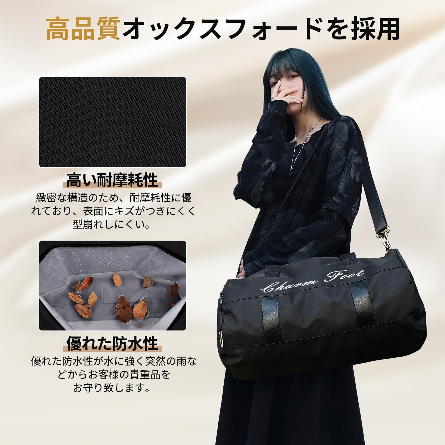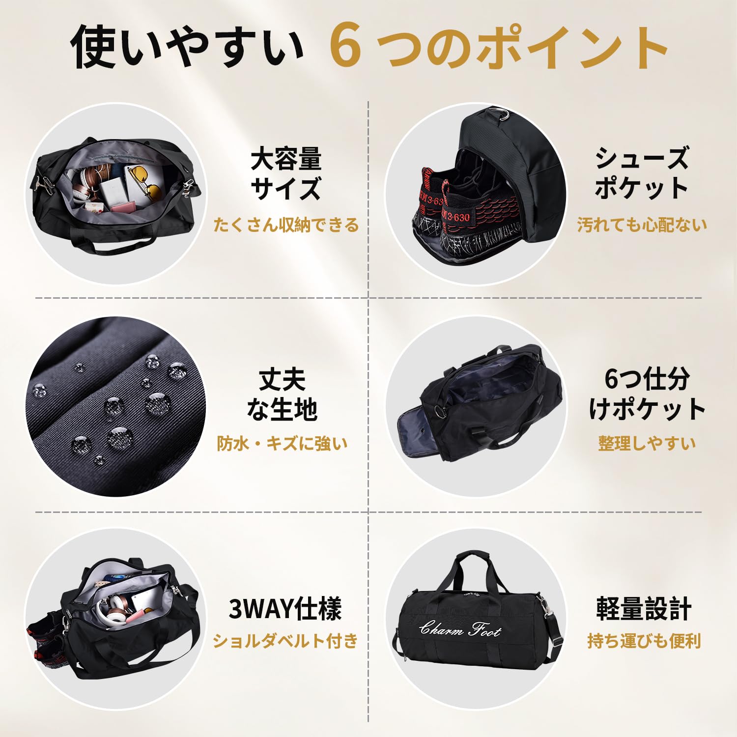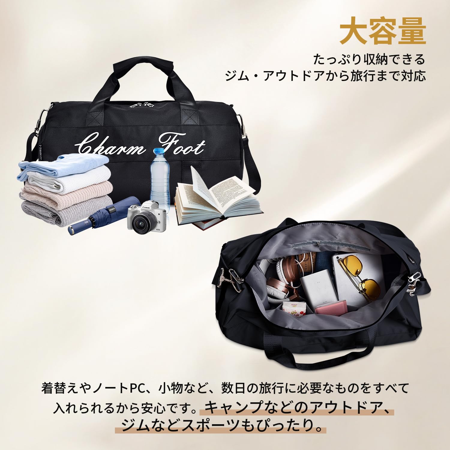[Charm Foot]ボストンバッグ スポーツバッグ ジムバック メンズ レディース ダッフルバッグ 旅行バッグ シューズバッグ 大容量 3WAY ユニセックス 乾湿分離 アウトドア 機内持ち込み 修学旅行 斜めがけ 手提げ 肩掛け 男女兼用 32L 1泊 2泊。 【3WAYで使い方色々】 軽量でシンプル。 上品な生地感で使いやすい落ち着いた大人デザイン。 手持ち・斜め掛け(肩ベルト)・肩掛け(肩ベルト)と3wayのスタイルで使用が可能です。 取外し・調整可能のショルダーベルトは肩に負担を掛けないクッションパッド付きで、肩掛け・斜め掛けで長時間背負っても快適です。 使わい時はA4程度に折りたたみが可能で、急に荷物が増え時のサブバッグとしても活躍します。 【シューズ収納&乾湿分離ポケット】この旅行バッグは靴収納ポケットを設けて、通気孔は二つ付きので、シューズを分けて収納して、運動後の臭いも気にならず、ほかの荷物を清潔に保ちます。 背側は独立な防水ポケットがあって、濡れた衣類、タオル、水着などは収納できます。 【防水生地&YKKファスナー】このボストンバッグは高品質なオックスフォード防水生地素材を採用し、耐磨耗性、耐久性にも優れております。 突然の雨でも安心な撥水加工が施されているので中の衣類や電化製品を雨から守ります!ファスナーもYKKという素材を作りますので、磨耗に強く耐久性があります。 【多用途バッグ】このボストンバッグは合宿やキャンプやフィッシングなどのアウトドア活動・ジムやゴルフやヨガなどスポーツに大活躍するだけでなく、修学旅行、遠足、出張、研修、緊急災害用等々幅広く活躍します。 ファッションなデザインで、観光、学校なども利用できます。 普段使いでジムバッグで、トレーニングなどの習い事の際、様々なシーンで活躍できます。 【商品仕様】容量:32L;サイズ:約長さ48cm*幅27cm*高さ27cm;ショルダーベルト約55~105cm;ポケット設計:外側4つ(メインポケット、シューズ収納ポケット、乾湿分離ポケット、フロントポケット)、内側3つ(小物収納ポケット*2、ファスナーポケット*1)合計7つのポケットがあって、服や洗濯用品など様々物をたっぷり収納できて非常に便利です。 S000-K1007