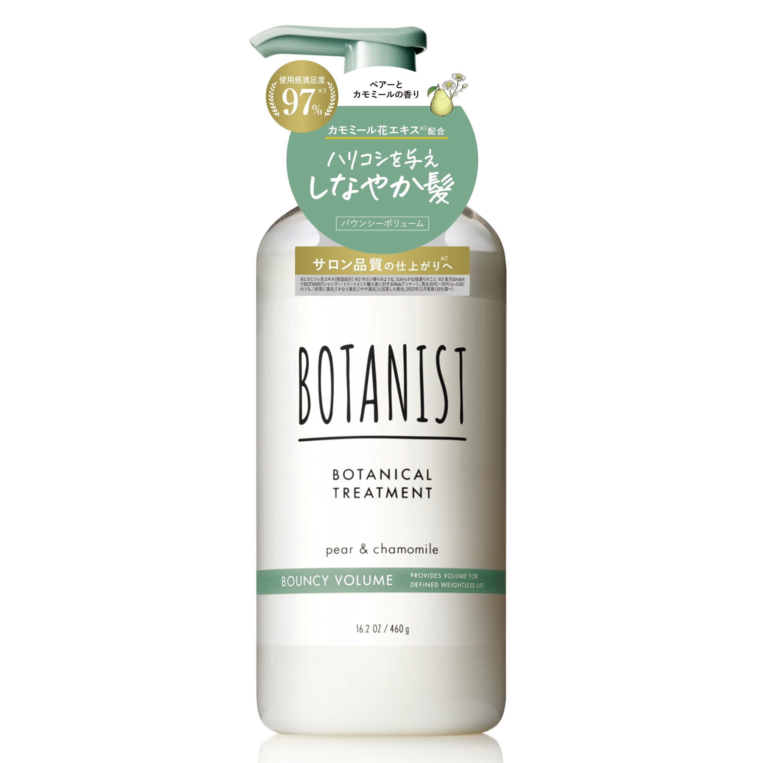 BOTANIST ボタニスト | トリートメント バウンシーボリューム 460g。 【リニューアル】髪を自然で満たしきる。 【内容量】460g。 【香り】清らかで純粋なペアーとカモミールの香り。 【仕上がり】ハリ・コシのある、しなやかな髪に仕上げます。 【おすすめ】ボリュームを出したい方。 S000-K9999