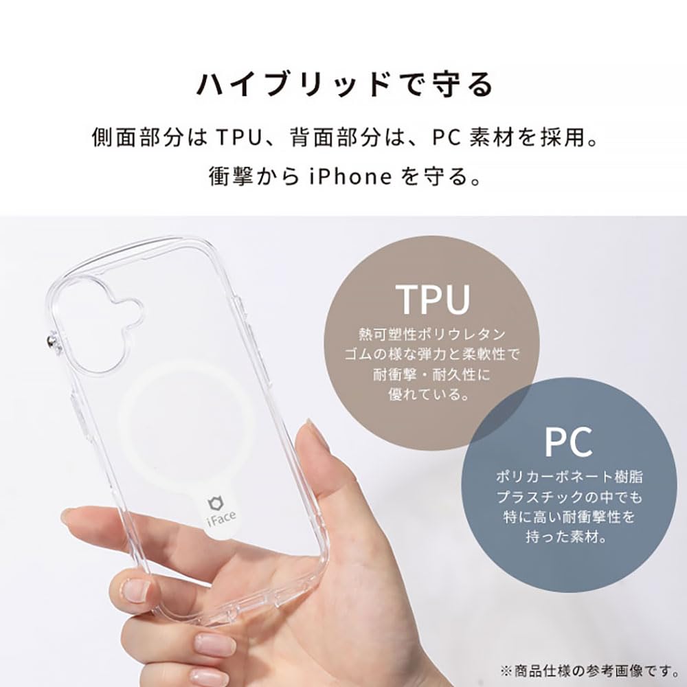iFace MagSafe 対応 Look in Clear Hybrid iPhone 16 Pro Max ケース MagSynq(クリア)【アイフォン16プロマックス クリアケース アイフェイス 透明 スマホケース 耐衝撃 カバー マグネット搭載 マグセーフ対応 ストラップホール付き】。 【MagSafe対応】弾力のあるTPUで、端末をしっかり保護。 シンプルなデザインに機能性、耐衝撃性を備えた、ミニマルなケース。 縁部分も透明なので、iPhone本体の色を楽しむことができます。 【こだわりのデザイン】手にしっかりフィットする「くびれ」形状で持ちやすいだけじゃなく、画面とカメラを守る縁高設計。 背面のドット加工で密着痕を防ぎ、見た目を美しく保ち、サイドホールもしっかり対応。 【選べる2カ所のストラップホール】シグネチャーボール搭載でストラップの付け方が広がる。 本製品ご使用における人体・デジタルデバイス本体を含む持ち物・データなどの損傷、損失、紛失に対し、弊社は一切の責任を負いかねます。 本製品およびパッケージは改良のため予告なく仕様を変更する場合があります。 記載されている製品名・会社名などは各社の商標または登録商標です。 デジタルデバイス本体やケースに発熱などの異常がある場合は本製品を外してください。 画面保護フィルムの形状により本製品と併用できない場合があります。 背面カメラでの撮影時に写り込みが起こる場合があります。 ご使用の充電器や環境によってワイヤレス充電がご利用いただけない場合があります。 ご利用状況・環境、溶剤の使用などにより変色や変質が起きることがあります。 S320-K9999