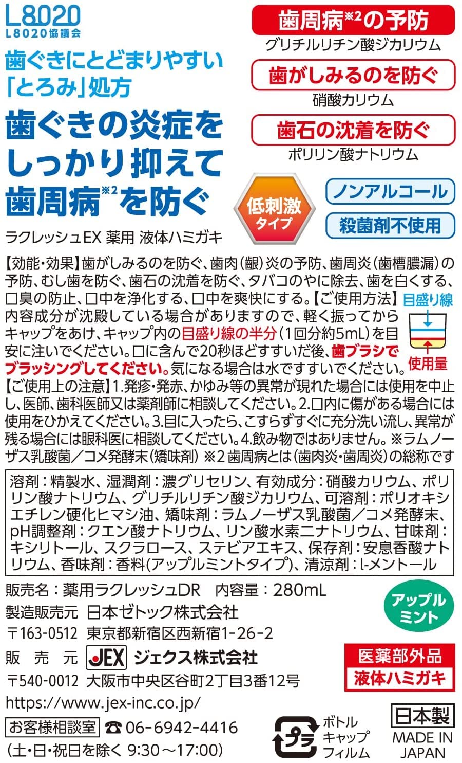 【まとめ買い】ラクレッシュ EX 薬用液体はみがき 280ml×4個セット 医薬部外品 ホワイトニング効果 歯周病。 商品の説明 L8020乳酸菌を使用した薬用液体ハミガキです。 液体タイプのハミガキだから、お口のすみずみまで薬用成分が行き渡ります。 歯ぐきにとどまりやすい独自の「とろみ」処方です。 グリチルリチン酸ジカリウムが、歯周病を防ぎ、硝酸カリウムが、歯がしみるのを防ぎます。 歯石の沈着を化学的に分解し、浮かせて落とすホワイトニング効果。 ラクレッシュシリーズはじめての「医薬部外品」処方 ・L8020乳酸菌使用 ・殺菌剤不使用 ・ノンアルコール ・歯ぐきにとどまりやすい「とろみ」処方 ・グリチルリチン酸ジカリウム:歯槽膿漏/歯肉炎の予防⇒歯周病(出血/腫れ予防) ・硝酸カリウム(5%):知覚過敏の予防⇒知覚過敏緩和 ・ポリリン酸ナトリウム:歯石沈着の防止/たばこのヤニ除去⇒ホワイトニング効果 安全警告 大险の好にしてください。 官名大险の好にしてください。 大险の好にしてください。 大险の好にしてください。 大险の好にしてください。 大险の好にしてください。 大险の好にしてください。 内容量:280mL×4個セット。 分類:医薬部外品。 風味:アップルミント風味。 特徴:L8020乳酸菌使用。 液体タイプのハミガキ。 独自のとろみ処方でお口のすみずみまで有効成分が行き渡ります。 歯石の沈着を化学的に分解し、浮かせて落とす。 抗炎症作用により、歯肉炎、歯周炎を予防。 カリウムイオンが、歯髄神経への刺激をブロック。 S000-K9999