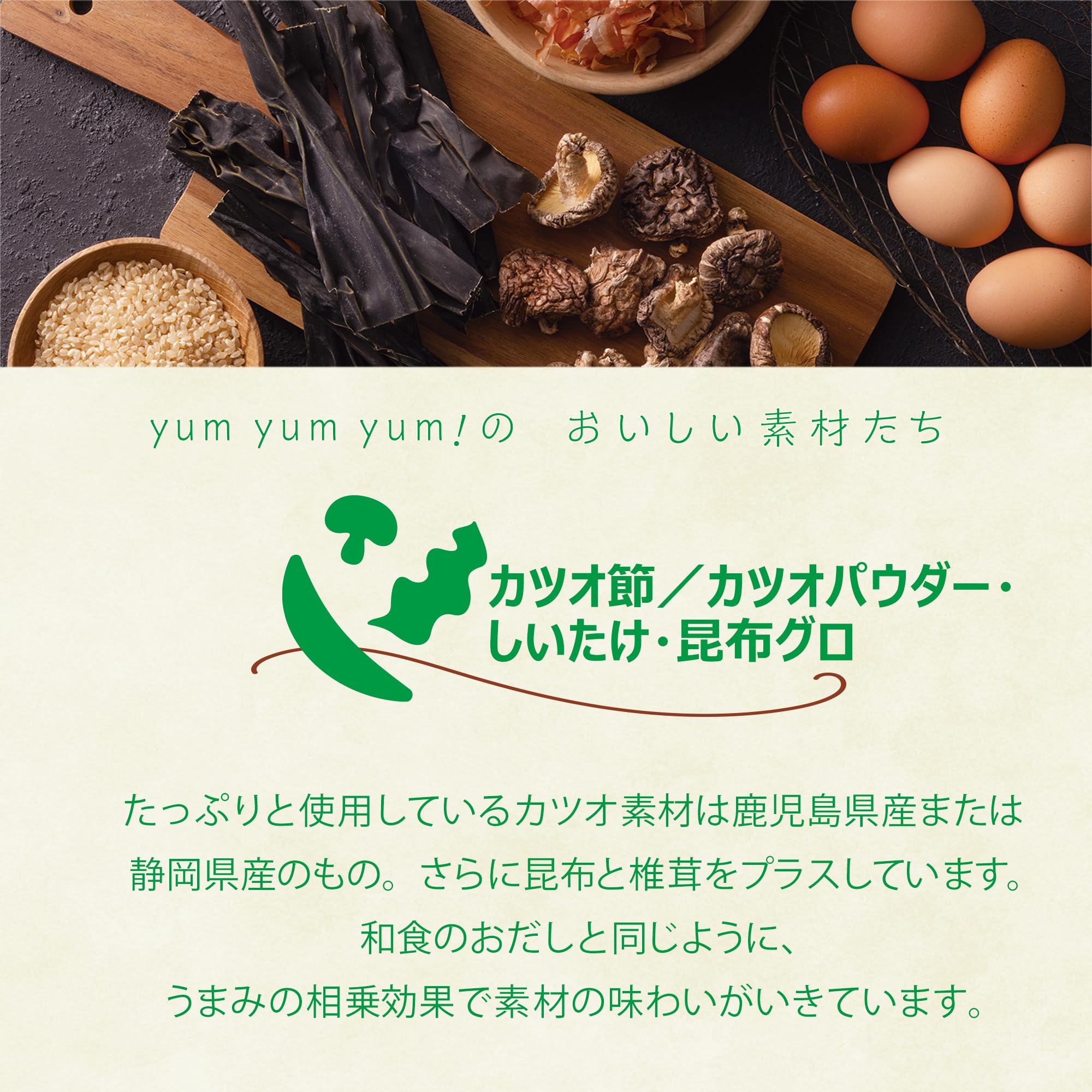 yum yum yum! ヤムヤムヤム ドッグフード パピー 800g 子犬用 成長期用 犬用総合栄養食 国産 チキン味 国産。 【子犬期特有の高い栄養要求量に対応】 健康的な子犬期の急激なからだの成長を守るために、栄養たっぷりのレシピでつくりました。 レシピに工夫を凝らし、からだの組織や骨の成長に欠かせないタンパク質や脂質、カルシウム、リンを豊富に配合。 さらに乳酸菌やフラクトオリゴ糖を加えて未熟な腸内環境の健康維持にも配慮しています。 【食べやすいフード粒】噛む力が未発達な子犬の食べやすさに配慮して、小粒でサクッとした食感のフード粒に仕立てました。 形状はyum yum yum! の既存品である全年齢用ドライフードやシニア&ライトと同じ円柱形なので、成犬になってごはんを切り替える際もスムーズです。 【おいしい素材をたっぷり使用】犬たちがおいしいと感じる素材をふんだんに使用しています。 九州産の若鶏生肉をメインに、カツオ節やアジ節、そして国産の昆布やしいたけといった和風だしのうまみ素材を配合。 うまみの相乗効果で、素材の味が際立ちます。 【ノン・オイルコーティング】素材本来のおいしさを大切にするために、オイルコーティングは行っていません。 良質な素材とオリジナル製法で、素材のうまみと香りがいきています。 【食品レベルの製造・品質管理】製造は、HACCPやISO22005の外部認証を取得している食品会社がそのノウハウに準拠して運営管理するペットフード工場*で行っています。 素材も製造も品質第一です。 *ペットフード工場での取得認定はありません。 S000-K9999