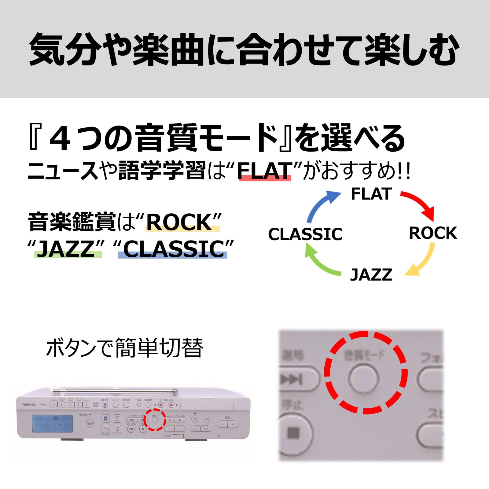 TOSHIBA(東芝) TY-ANX2(W) CDラジオ SD USB再生 Bluetooth 送受信機能 コンパクト スリム ネオジウムスピーカー スリープ タイマー 搭載 ワイドFM 対応。 楽曲や気分で選べる4つの音質モード(FLAT/ROCK/JAZZ/CLASSIC)。 Bluetooth送受信機能を搭載。 厚みのある高音質再生を可能にする密閉型ネオジウムスピーカー。 多彩な語学学習機能。 ラジオのタイマー録音機能搭載。 SDカード⇔USBメモリーへの録音が簡単!。 スリープタイマー機能。 便利なリモコン付き。 S000-K9999