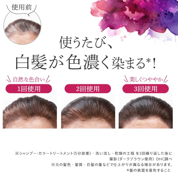 DHC Q10 プレミアム カラートリートメント 235g 〔ブラックブラウン〕。 商品紹介 自宅で簡単・手軽に、白髪をしっかり色濃く、理想の髪色に染める*ことができるカラートリートメントです。 放置時間は1回5分! イオン性カラー&極小分子カラーの「Wカラー成分」が髪に浸透することで、使うたび白髪が深く色づき*、美しく自然な色合いに仕上げます。 キューティクルまでケアする「カラーフィックス・キューティクルコート※1」をプラス。 色落ちを防ぎ、染めたての色つやをキープします。 さらに、うねりをケアする機能※2によって、白髪の悪目立ちを防ぎ、若々しく美しい髪へと導きます。 コエンザイムQ10など豊富な天然由来の美容液成分も配合しました。 トリートメントの名にふさわしいダメージ補修力で、毛髪コンディションを整え、健やかに保ちます。 ジアミン系の染料不使用で髪と地肌にやさしく、刺激臭のない処方のため、トリートメントとして毎日お使いいただけます。 イランイラン、ゼラニウムといった優美な花々と、オレンジ、ベルガモットなどのフレッシュな果実から生まれたアロマティックミストの香り。 軽やかな仕上がりのノンシリコン処方。 使用方法 1回5分! 安全警告 外用のみ。 1回5分! 美しくつややかな理想の髪色に染める白髪用カラートリートメント。 ダメージの気になる髪に、うるおいとつやを与える美容液設計。 ジアミンフリー・シリコンフリー・パラベンフリー 天然成分配合。 S000-K9999